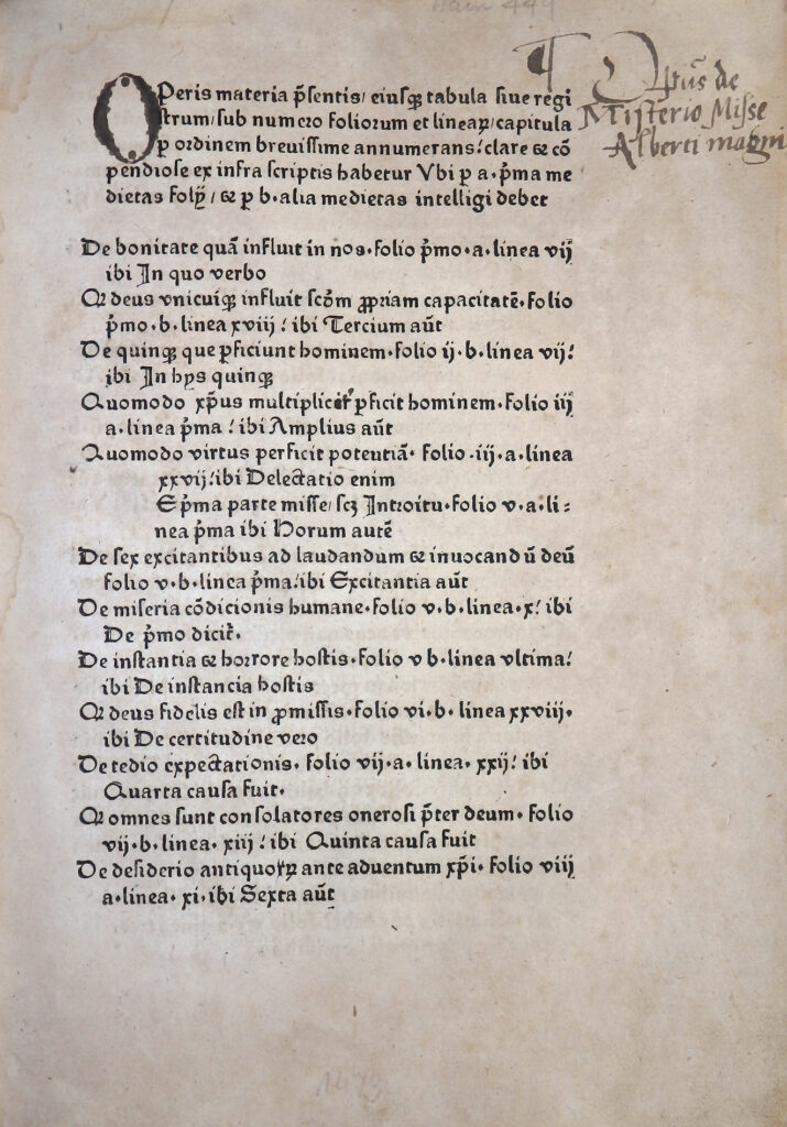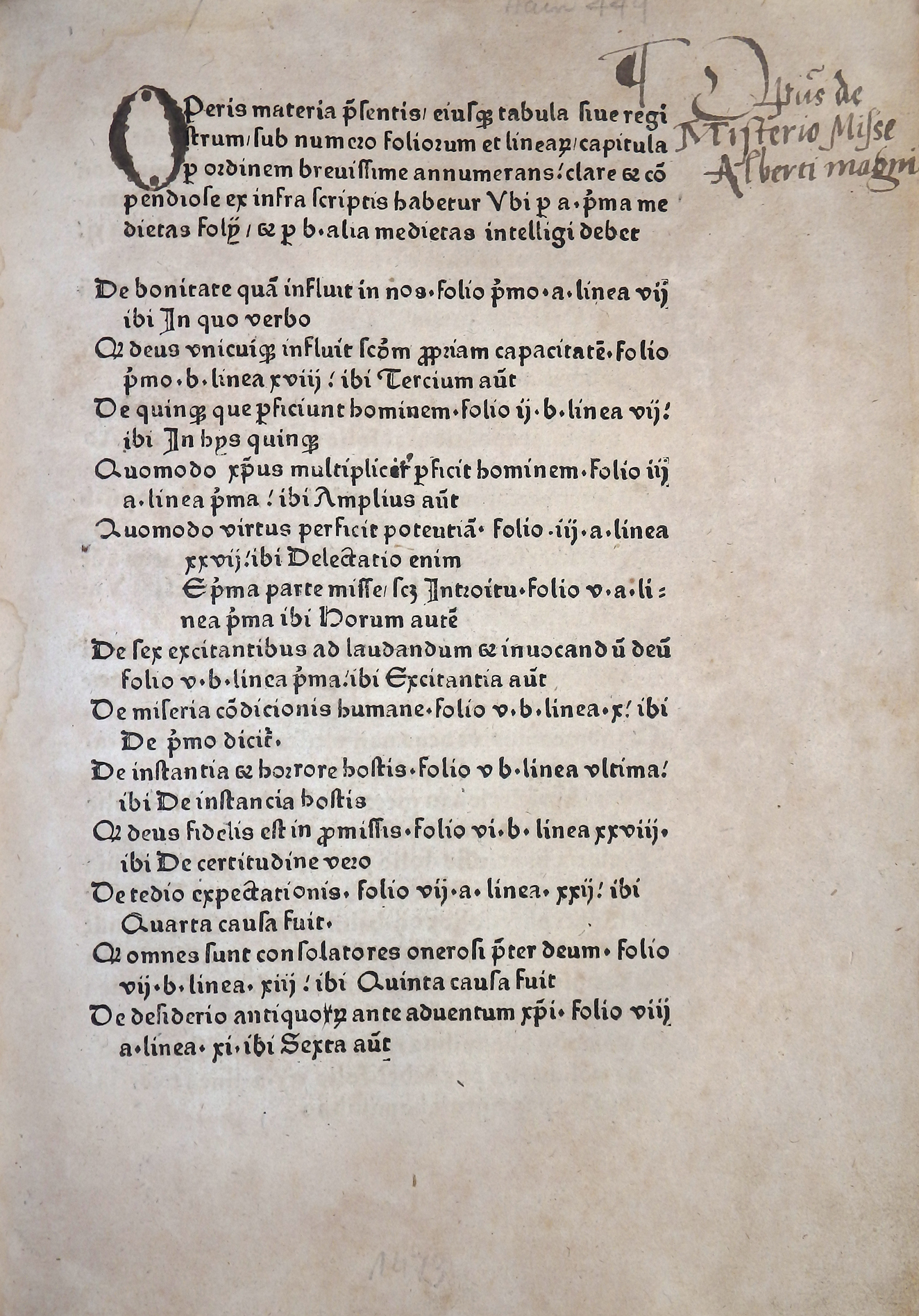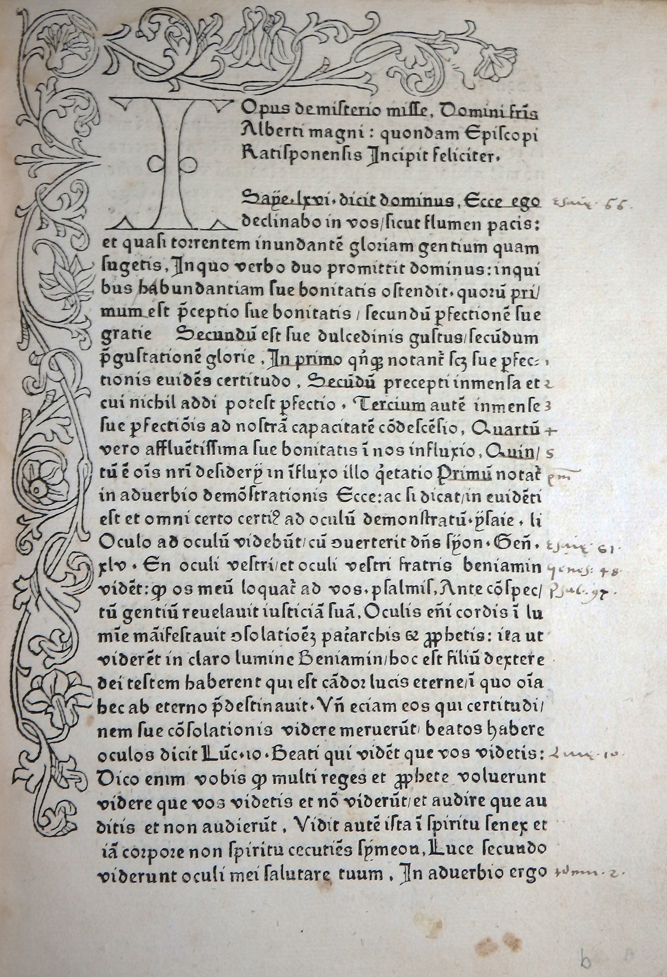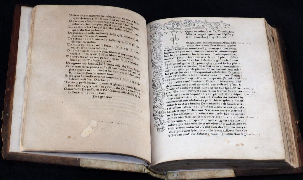 Erste Ausgabe eines der frühesten Druckwerke des Ulmer Erstdruckers. Johann Zainer eröffnete im Januar 1473 seine Druckerei. Die Weinranke auf Blatt 5 wird dem Meister des Ulmer Boccaccio zugeschrieben. Albertus Magnus wurde 1260 Bischof von Regensburg. Er gilt als Begründer der christlichen Aristotelik und damit letztendlich der modernen Naturwissenschaft. Bis zu seiner Interpretation waren die Werke von Aristoteles in der christlichen Welt wegen ihres heidnischen Ursprungs umstritten.