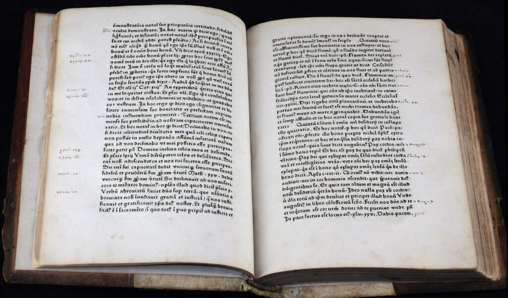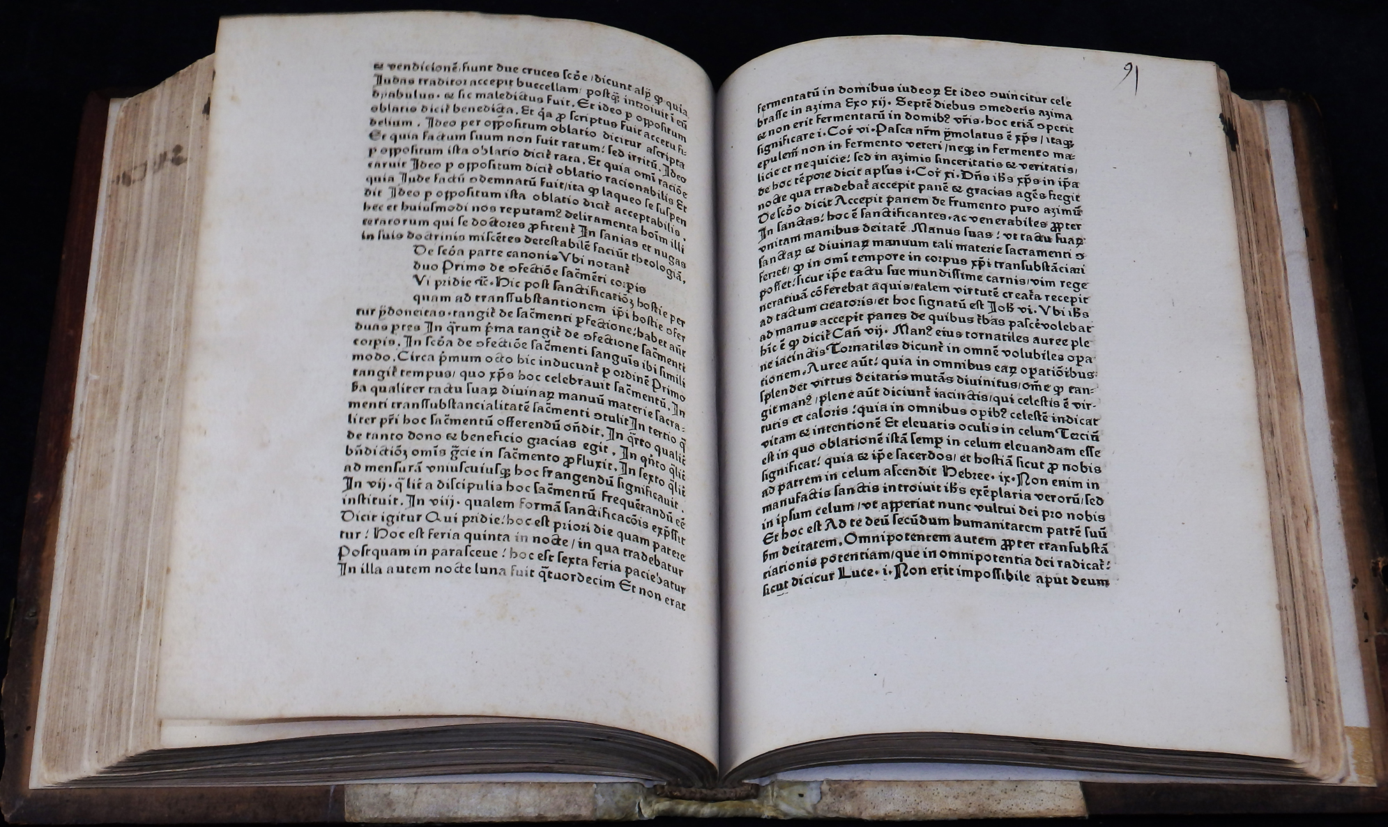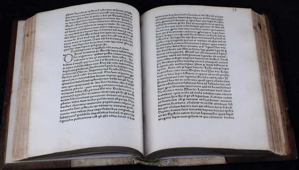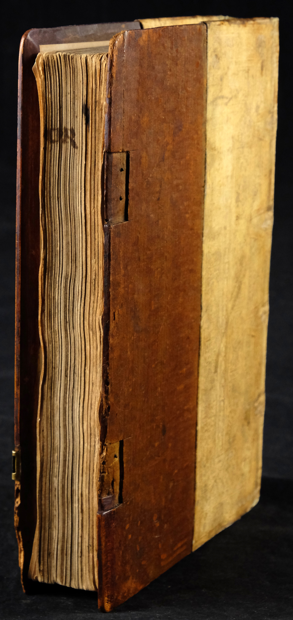 Zeitgenössischer Holzdeckelband mit übergreifendem, blindgeprägtem Schweinslederrücken. Gebunden auf vier Bünden. Der Block im 20. Jhd. neu eingehängt (Remboitage) und sorgfältig restauriert. Rücken mit schwarzgeprägtem Titel. Schließen entfernt.