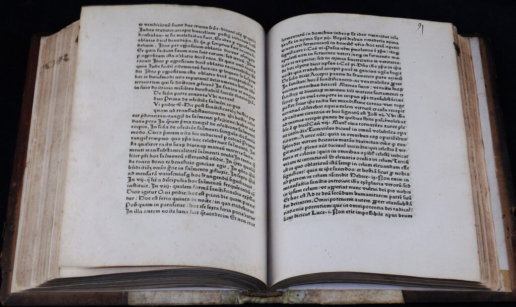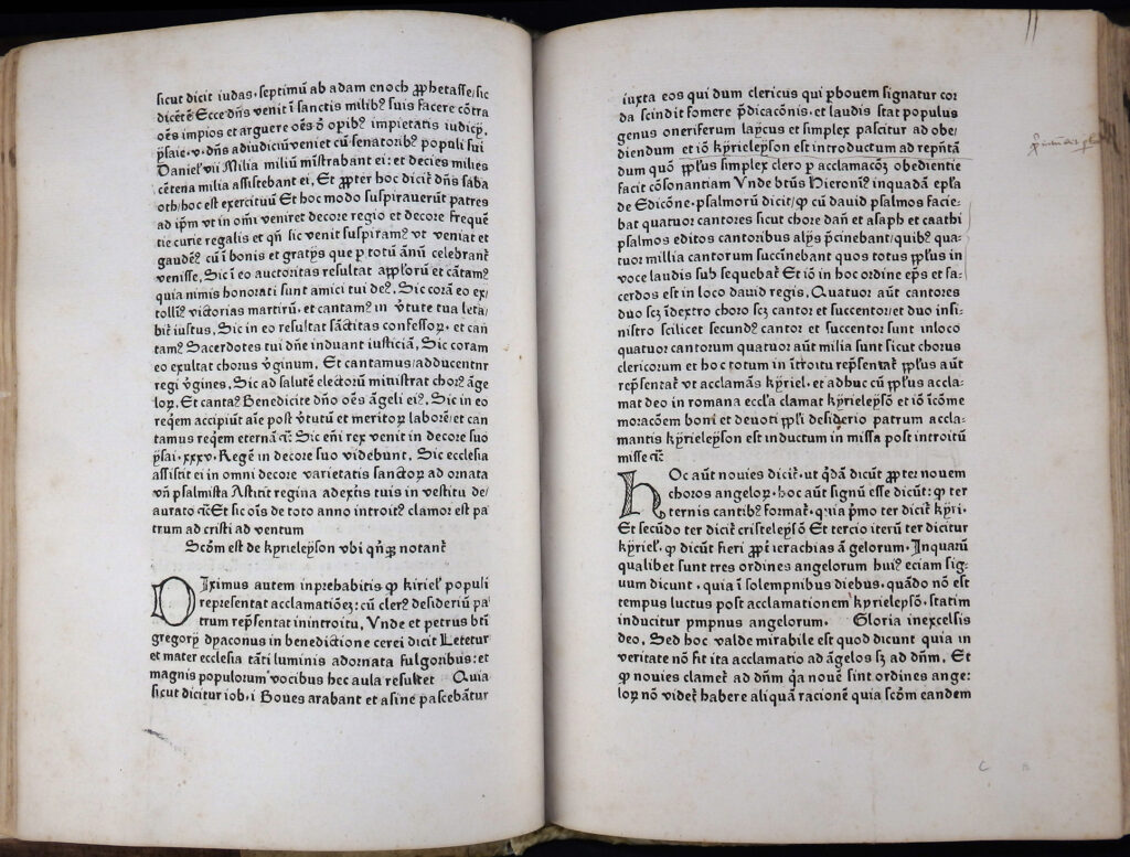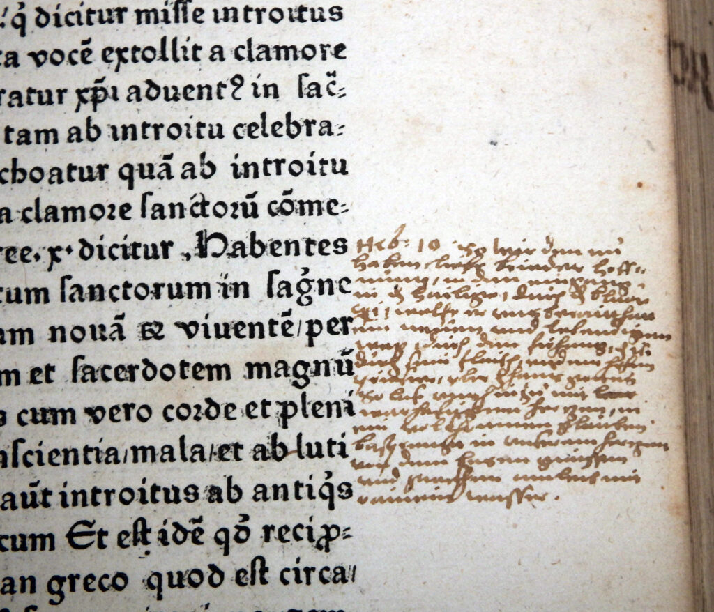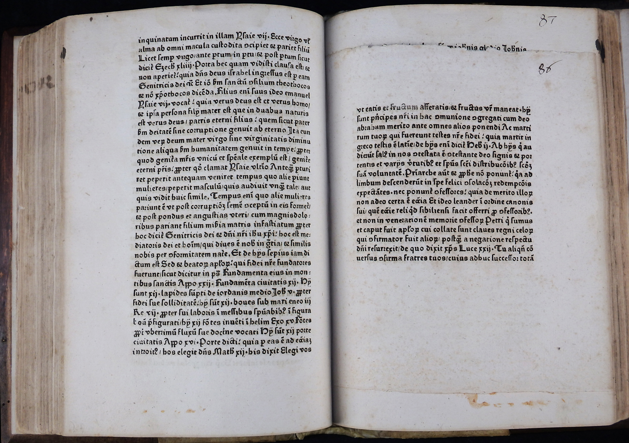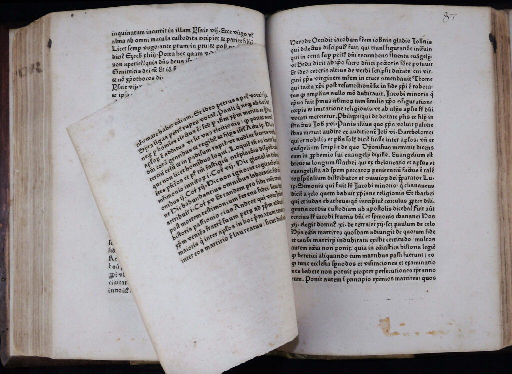 „Zwischen Blatt 7 und 8 der 10. Lage war eine Seite Text aus Versehen ausgefallen, die Zainer auf einem eingehängten halben Blatt nachholte, das auf jeder Seite mit 17 Zeilen bedruckt wurde“