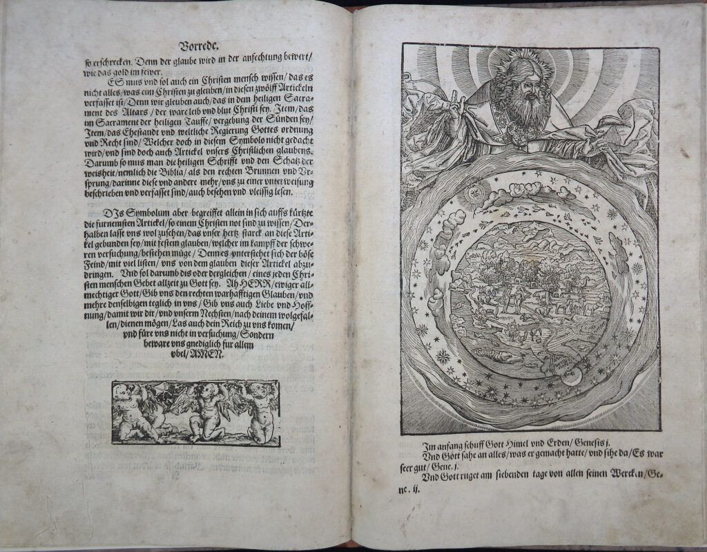 Die Titelbordüre des Werkes zeigt die zwölf Apostel auf einem Sockel stehend und stammt wohl von einem Cranach-Schüler. Das Blatt A4 zeigt einen nahezu blattgroßen Schöpfungs-Holzschnitt eines unbekannten Künstlers (Dodgson) nach Hans Brosamer.