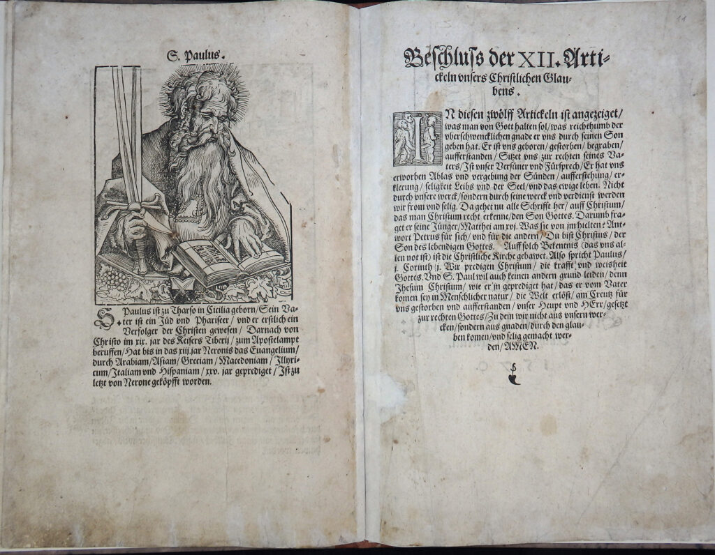 Wittenberger Neuauflage der 1549 bei Georg Rhaus Erben erschienenen Erstausgabe (VD16 P 4031). Das Werk besticht durch seine bedeutenden Illustrationen. Enthalten ist die aus 12 Blatt bestehende Holzschnittfolge von Lucas Cranach aus dem „Martyrium der Aposteln“ (Hollstein VI, 53-64; Bartsch XI, 282; Jahn 77a-82b; Rogner & Bernhard 520ff.) und dem Porträt des Apostel Paulus aus der „Zeigung des Heiligthums der Stiftkirch aller Heiligen zu Wittenberg, 1509“ (vgl. Hollstein S. 72; Jahn 67a; Rogner & Bernhard 520). Die Titelbordüre des Werkes zeigt die zwölf Apostel auf einem Sockel stehend und stammt wohl von einem Cranach-Schüler. Blatt A4 zeigt einen nahezu blattgroßen Schöpfungs-Holzschnitt eines unbekannten Künstlers (Dodgson) nach Hans Brosamer.