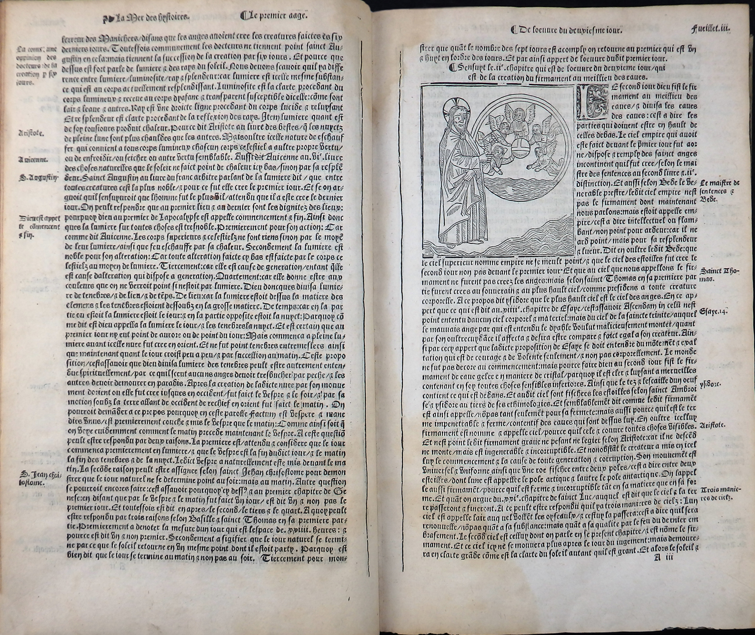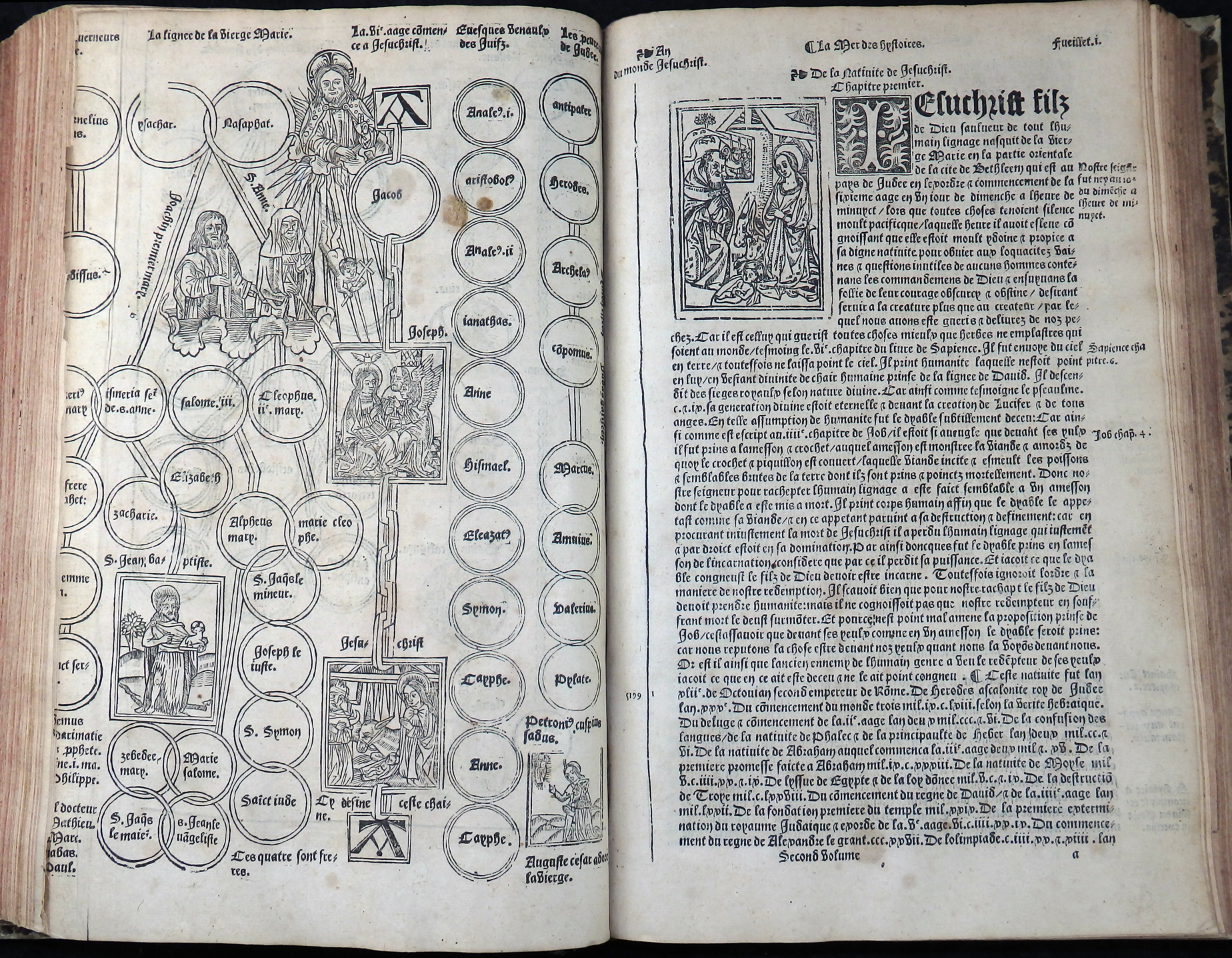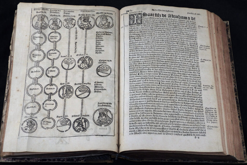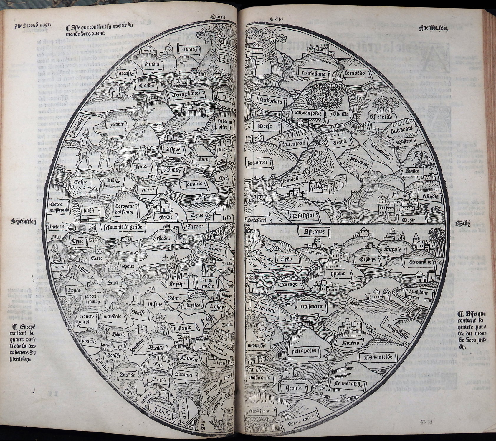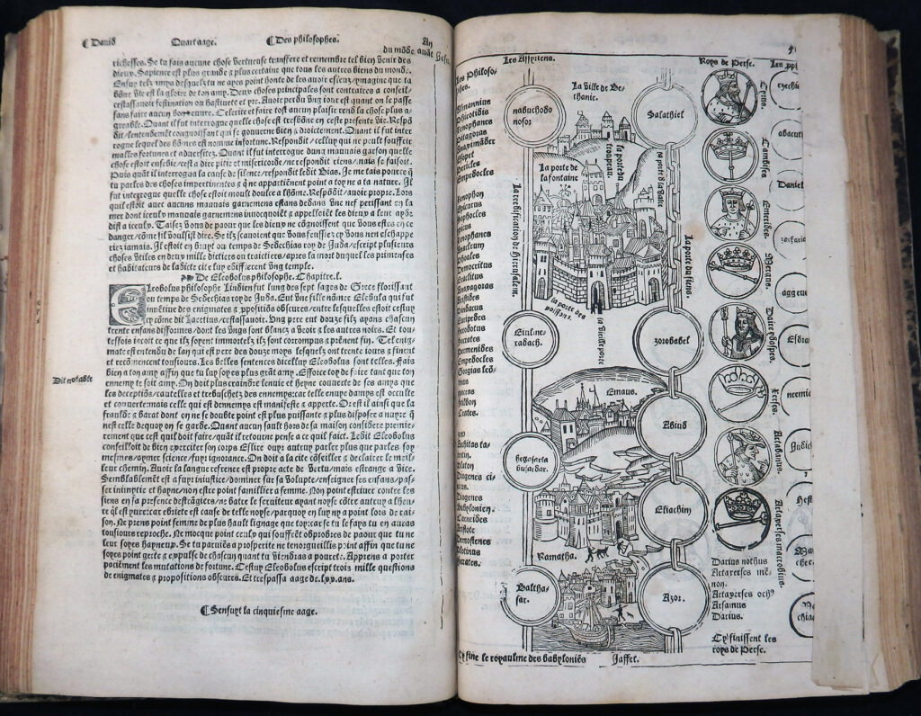 Einspaltige, 55-zeilige, gotische Type in französischer Sprache. Das Wer ist illustriert mit zwei imposanten Holzschnitt-Titelbordüren, 120 Holzschnitten, nahezu 50 Stammtafeln sowie der kostbaren, doppelblattgroßen Weltkarte (Blatt LVI/LVII) und der doppelblattgroßen Windbläserkarte des Heiligen Landes. Ferner findet man Hunderte von eingedruckten Holzschnitt-Initialen. Anstatt des Titels vorgebunden eine Karte von Griechenland und Mazedonien.