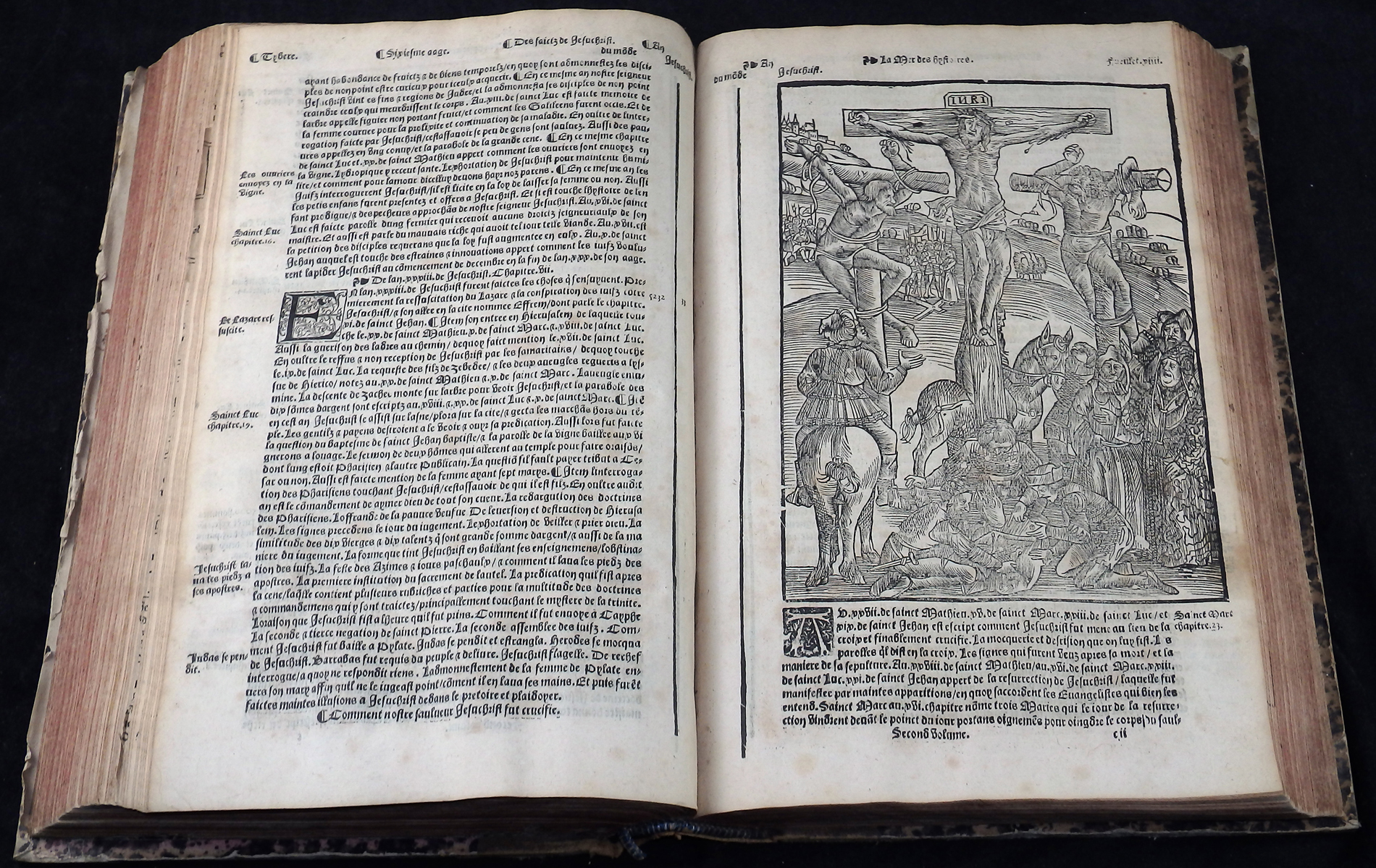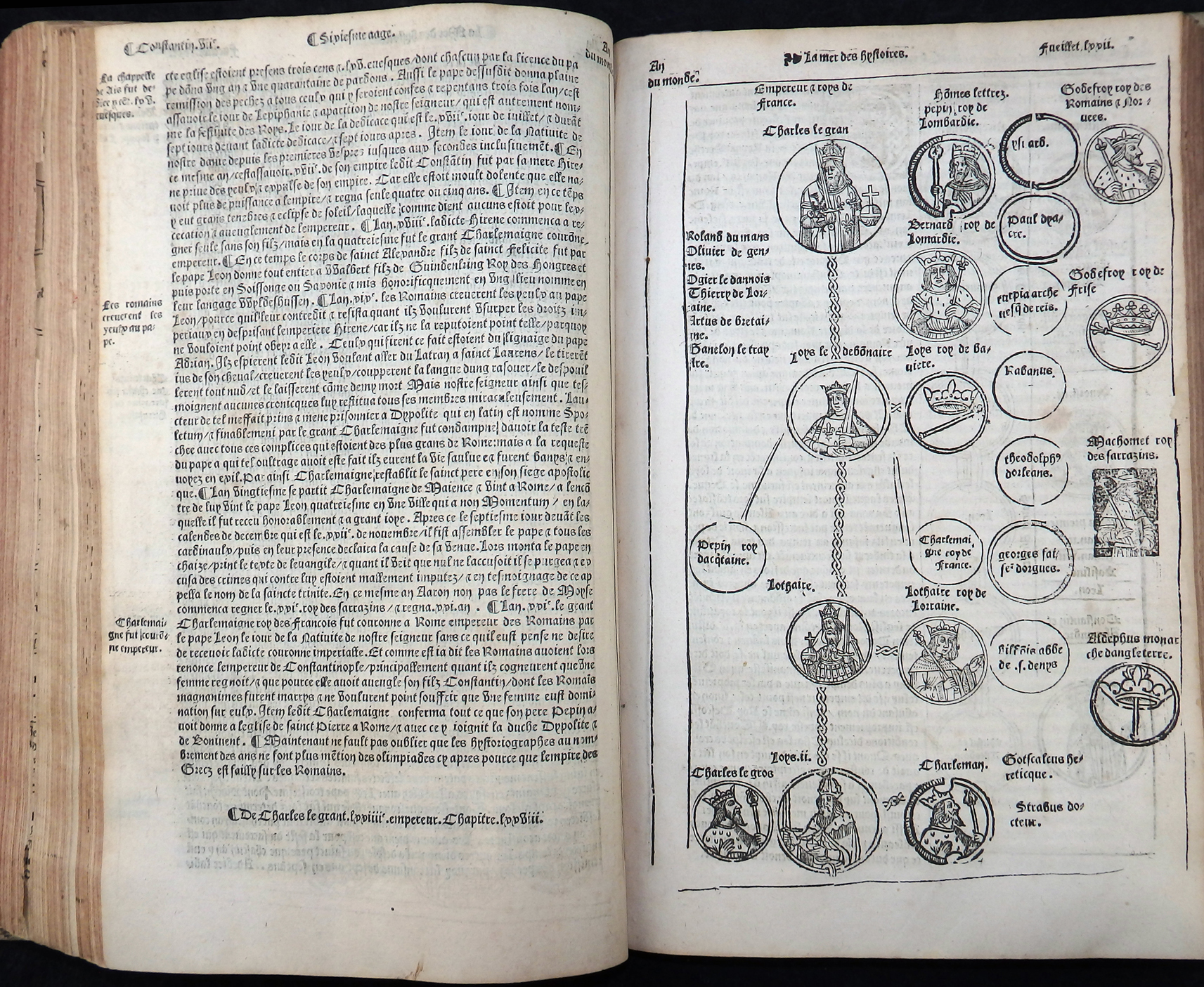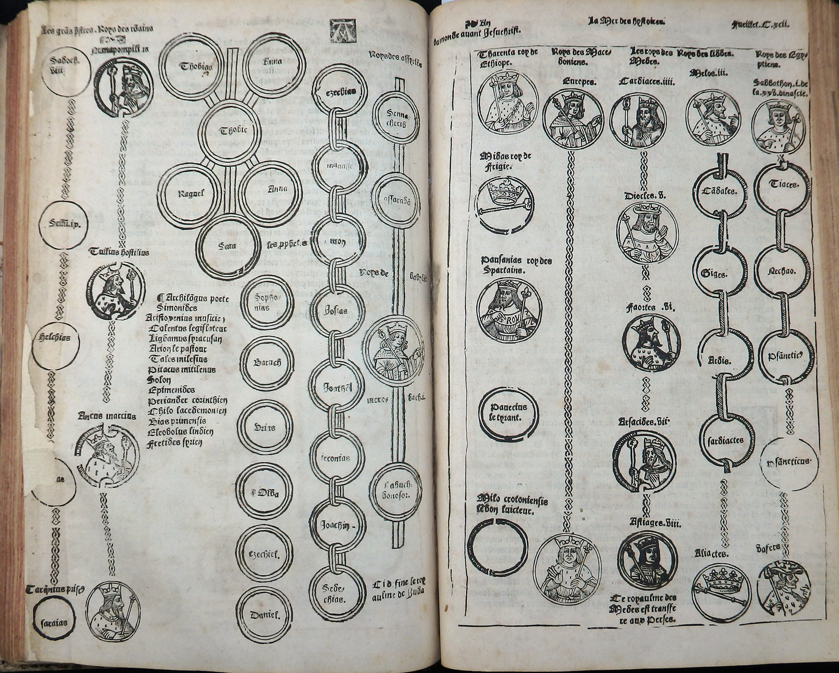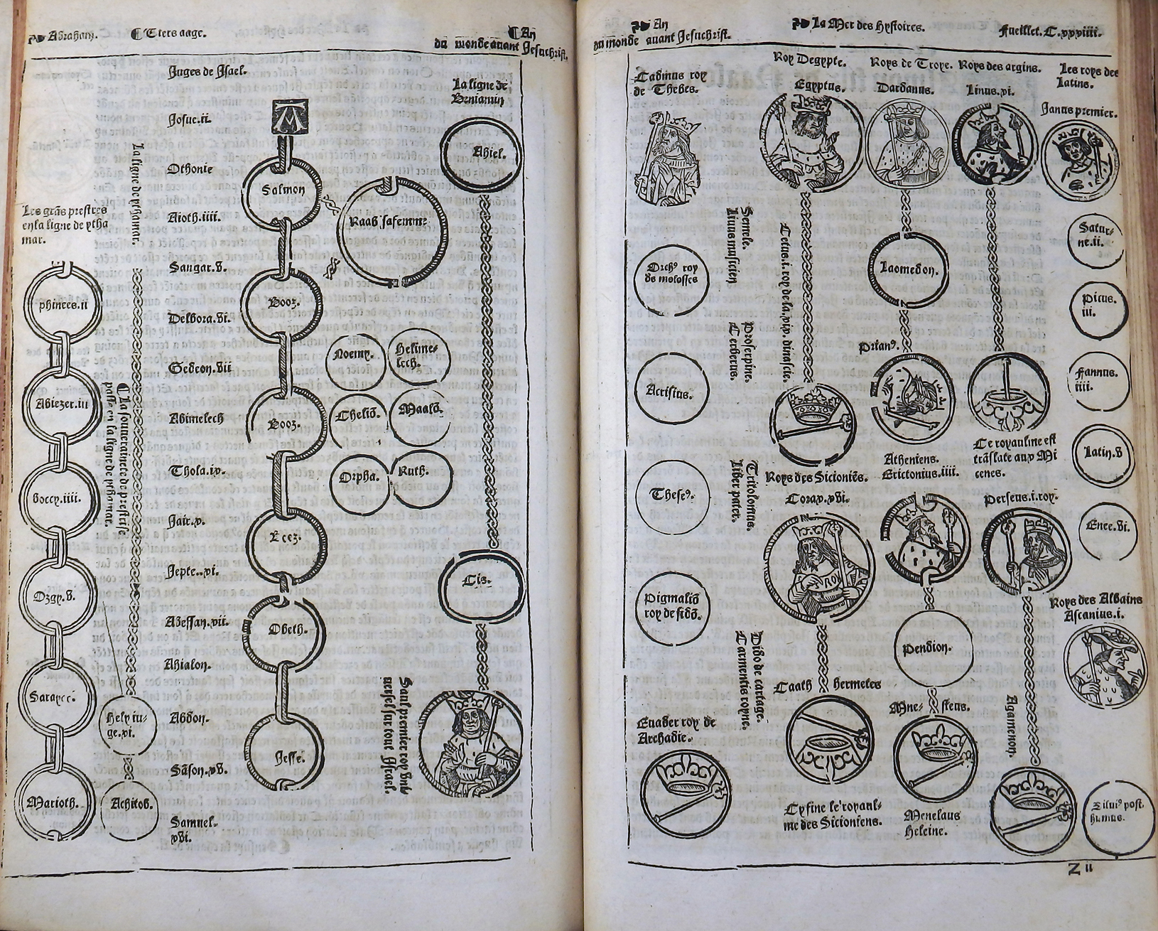 Einspaltige, 55-zeilige, gotische Type in französischer Sprache. Das Wer ist illustriert mit zwei imposanten Holzschnitt-Titelbordüren, 120 Holzschnitten, nahezu 50 Stammtafeln sowie der kostbaren, doppelblattgroßen Weltkarte (Blatt LVI/LVII) und der doppelblattgroßen Windbläserkarte des Heiligen Landes. Ferner findet man Hunderte von eingedruckten Holzschnitt-Initialen. Anstatt des Titels vorgebunden eine Karte von Griechenland und Mazedonien.