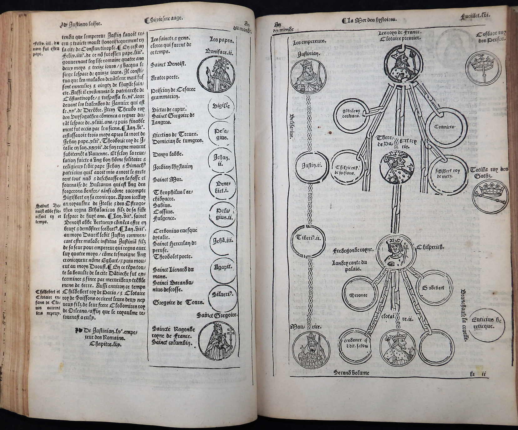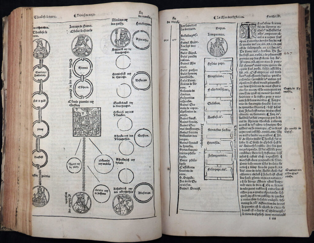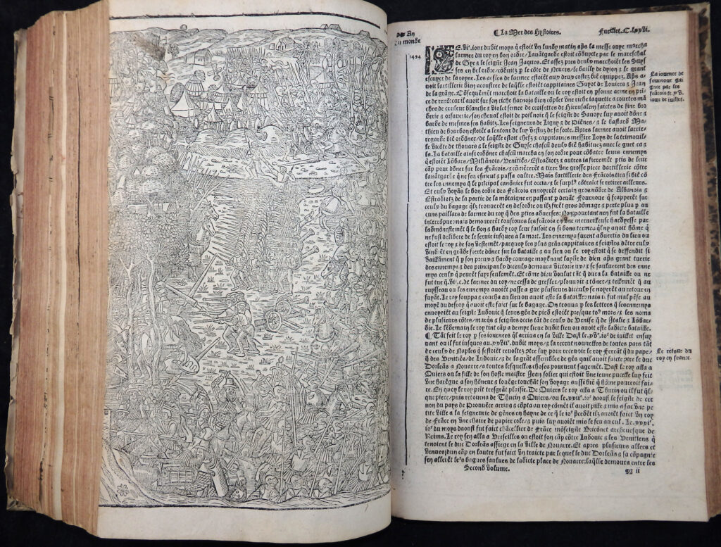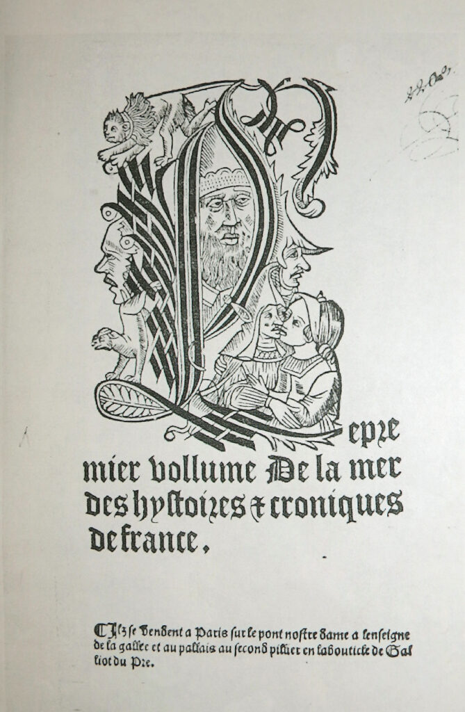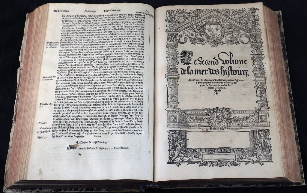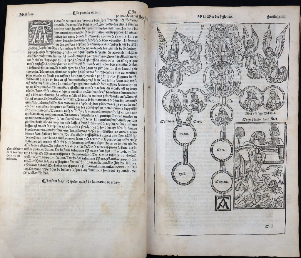 Äußerst seltene und bedeutende Universalgeschichte der bis ca. 1535 fortgesetzten Neubearbeitung und französischen Übersetzung der Weltgeschichte „Rudimentum Novitiorum“. Diese französische Ausgabe „stimmt – in erheblich verbesserter Ausstattung – mit dem Rudimentum novitiorum bis in die Aetas VI weitgehend treu überein, legt aber der Zeit Karls des Großen einen Akzent auf die französische Geschichte … Parallel geht erst wieder das abschließende Martyrologicum“ (Verfasserlexikon des Mittelalters, Band XI, 1344).