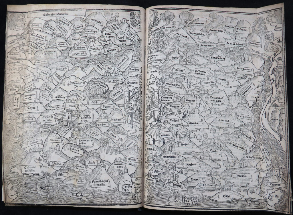 Die Karte Palästinas ist auf Jerusalem zentriert und ebenfalls mit Osten oben ausgerichtet. Dies war die erste gedruckte Karte, die auf Beobachtungen aus erster Hand basierte und Palästina anhand einer Pilgerreise aus dem 13. Jahrhundert darstellte. Die Karte erstreckt sich von Sidon und Damaskus im Norden bis zum Roten Meer im Süden. Acht Windköpfe umgeben die Karte.