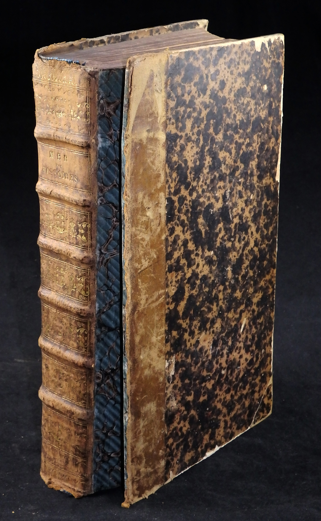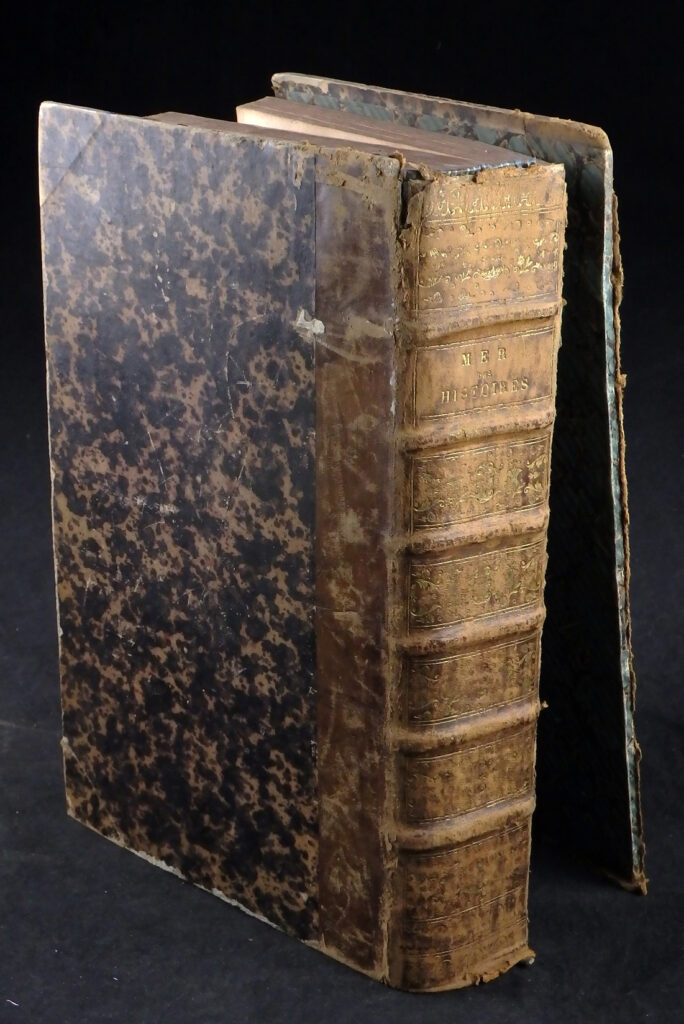 Brauner Halbledereinband mit sechs echten Bünden und marmorierten Pappdeckeln des 18./19. Jahrhunderts. Stärker berieben und an den Kanten lädiert. Vorderes Gelenk gebrochen, Vorderdeckel lose.