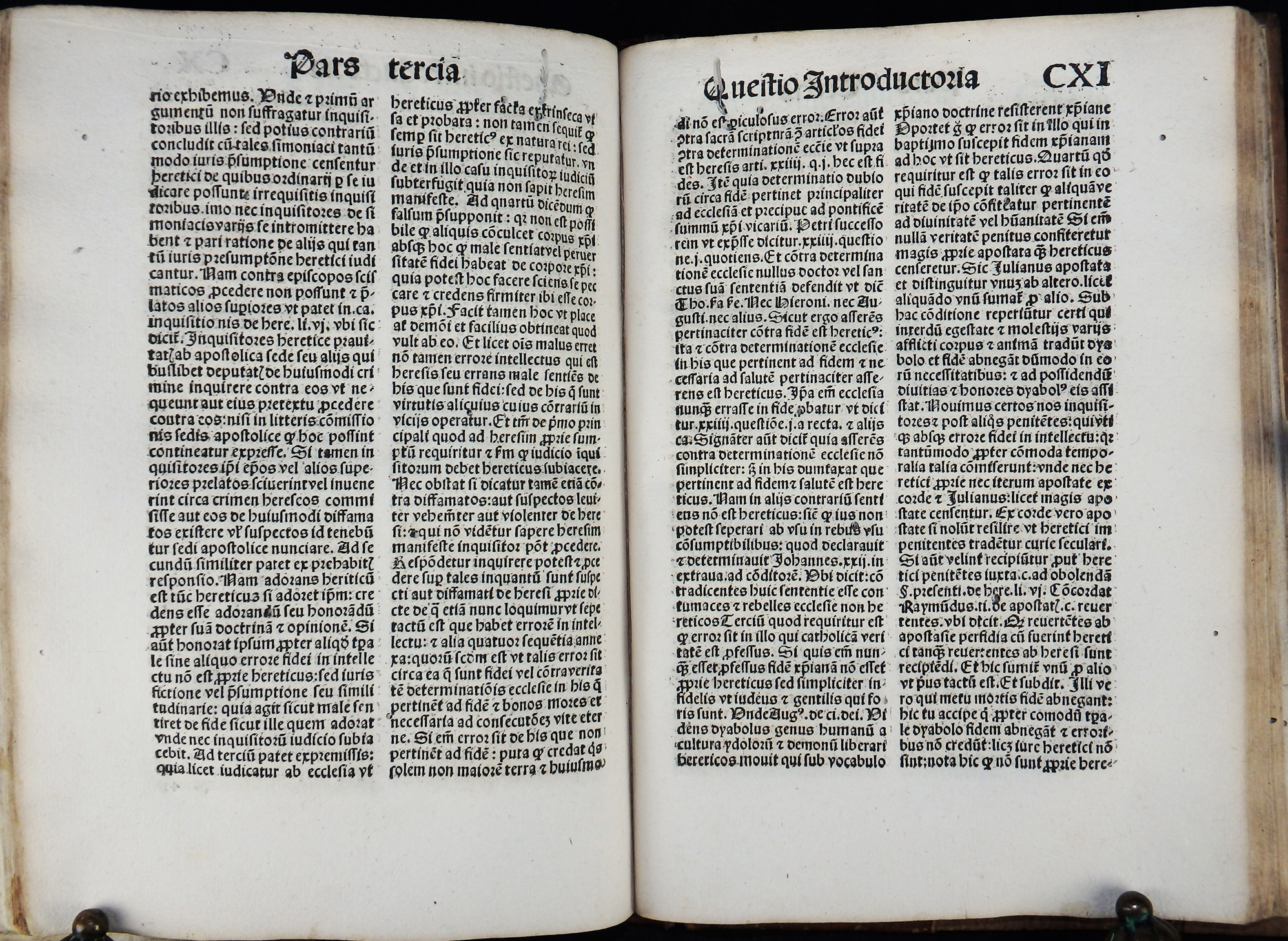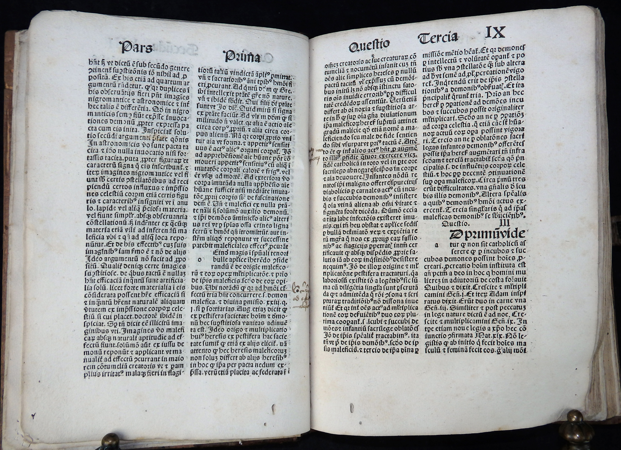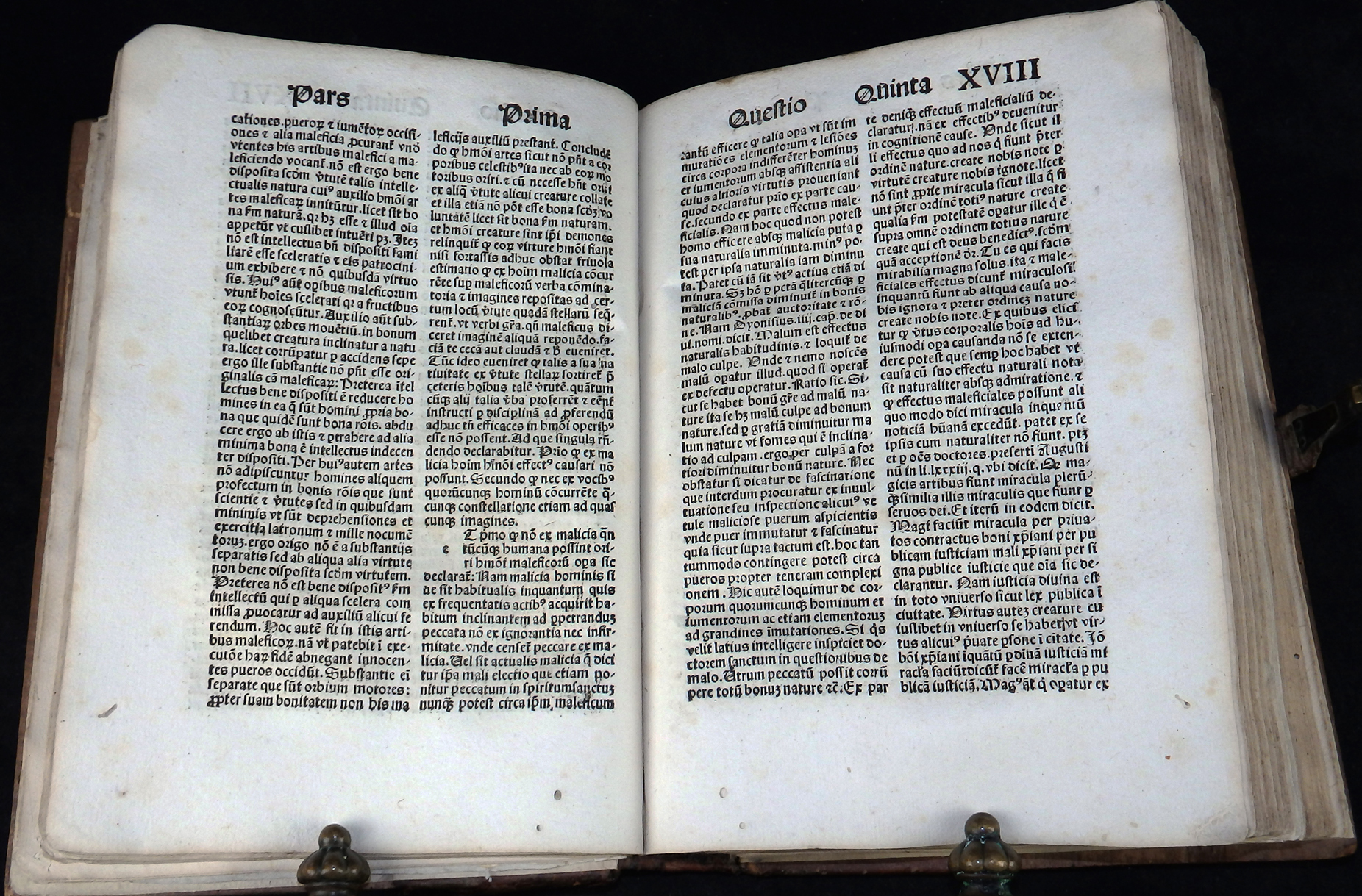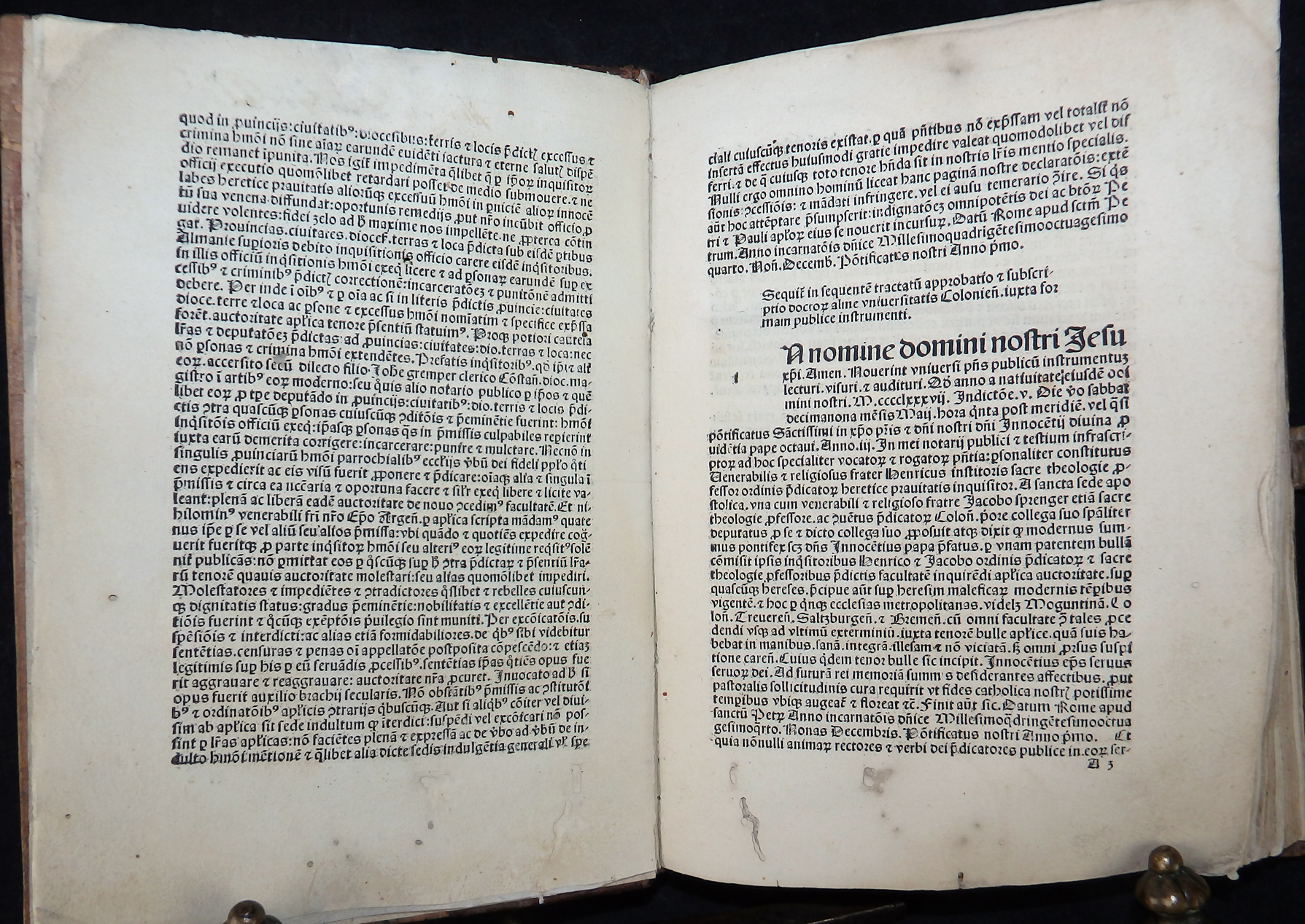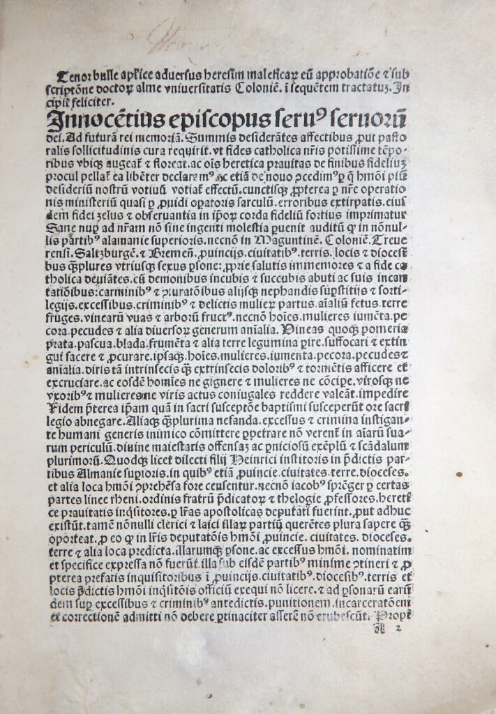 Äußerst seltenes Exemplar einer Inkunabelausgabe des berühmt-berüchtigten „Malleus Maleficarum“, des sogenannten „Hexenhammers“, gedruckt in der berühmten Nürnberger Offizin von Anton Koberger. Das Werk wurde erstmalig 1486 bei Peter Drach in Speyer in Druck gegeben und stammt aus den Federn der beiden Dominikanermönche Heinrich Kramer, latinisiert zu Henricus Institoris und Jakob Sprenger, dessen Mitautorschaft heute infrage gestellt wird, obgleich das Werk traditionell eher unter des letzteren Namen geführt wird. Sprenger bekleidete die Position des Inquisitors in den Erzbistümern Mainz, Trier und Köln und ab 1484 auch in den Erzbistümern Salzburg und Bremen, was zumindest seinen großen Einfluss auf den Hexenhammer belegt.