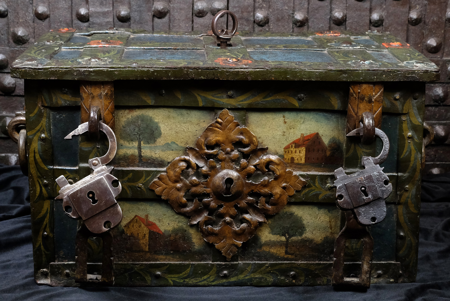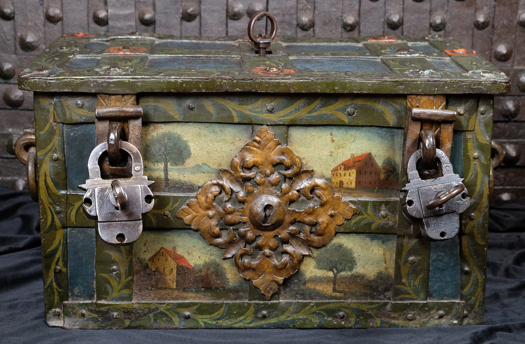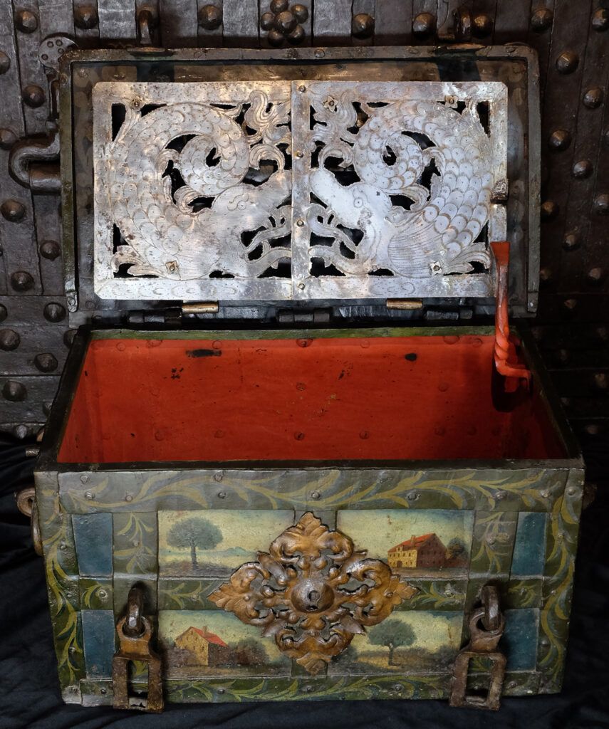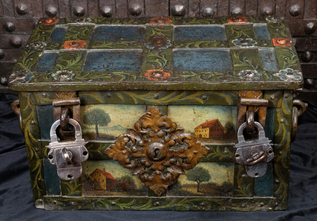 Attraktive barocke Eisenkassette mit zwei intakten Kleeblattschlössern. Rechteckiger eisenbeschlagener Korpus. Der Korpus ganzflächig reichhaltig mit polychromer Malerei. Frontseitig fein ausgearbeitete Landschaftsmalereien mit Häusern. Die Beschläge mit floralen Malereien. Vorn ein weit ausschweifender Schlossbeschlag mit einem Blendschloss sowie zwei Verschlussbügel, welche mit den Hangschlösser verschlossen werden. An den Seiten zwei tordierte bewegliche Henkel. Auf drei Scharnieren gelagerter Klappdeckel, oben mit einem ausklappbaren Trickhebel, welcher das eigentliche Truhen Schloss freigibt. Der fünf Riegel umfassende Schlossmechanismus mit einer gravierten Schlossabdeckung in Form zweier Meeresungeheuer bzw. Fabelwesen. Korpus innen in Rotmennige gefasst. Die beiden aus dem 17. Jahrhundert stammenden Kleeblattschlösser passen sich hervorragend in die Optik der Truhe ein. Gern kann die Truhe auch ohne diese oder mit anderen Schlössern erworben werden.