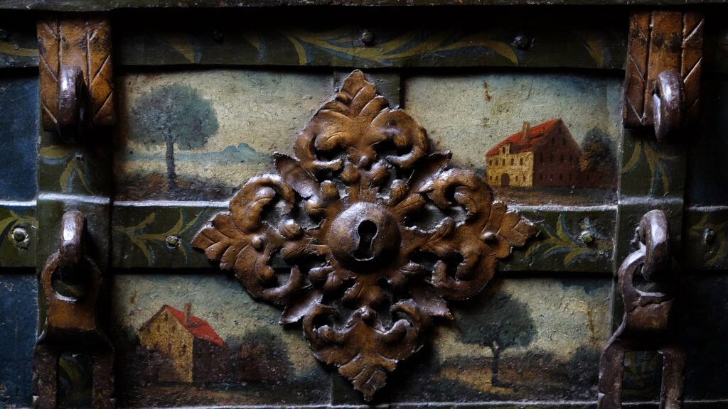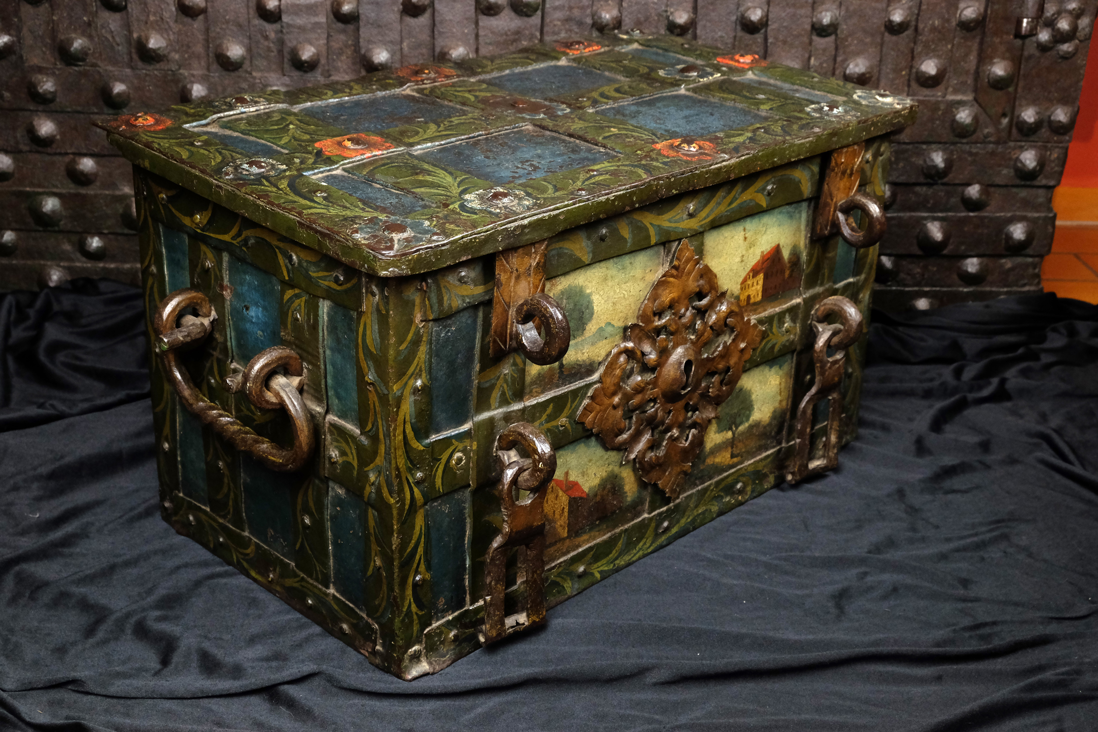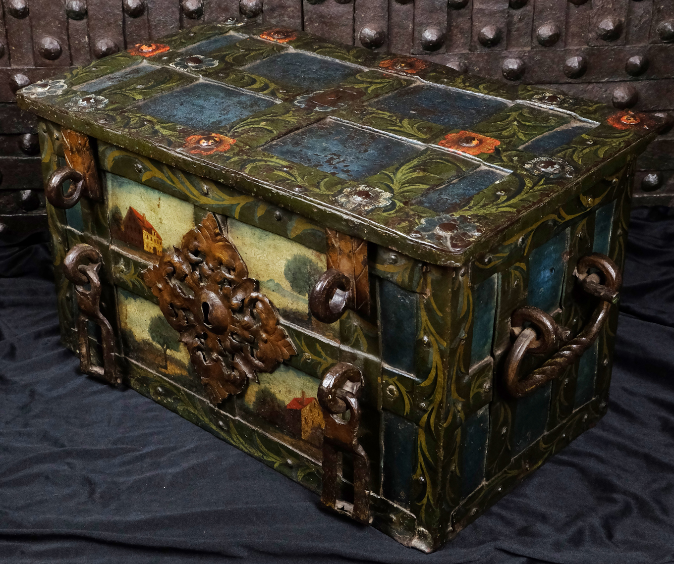 Attraktive barocke Eisenkassette mit zwei intakten Kleeblattschlössern. Rechteckiger eisenbeschlagener Korpus. Der Korpus ganzflächig reichhaltig mit polychromer Malerei. Frontseitig fein ausgearbeitete Landschaftsmalereien mit Häusern. Die Beschläge mit floralen Malereien. Vorn ein weit ausschweifender Schlossbeschlag mit einem Blendschloss sowie zwei Verschlussbügel, welche mit den Hangschlösser verschlossen werden. An den Seiten zwei tordierte bewegliche Henkel. Auf drei Scharnieren gelagerter Klappdeckel, oben mit einem ausklappbaren Trickhebel, welcher das eigentliche Truhen Schloss freigibt. Der fünf Riegel umfassende Schlossmechanismus mit einer gravierten Schlossabdeckung in Form zweier Meeresungeheuer bzw. Fabelwesen. Korpus innen in Rotmennige gefasst. Die beiden aus dem 17. Jahrhundert stammenden Kleeblattschlösser passen sich hervorragend in die Optik der Truhe ein. Gern kann die Truhe auch ohne diese oder mit anderen Schlössern erworben werden.