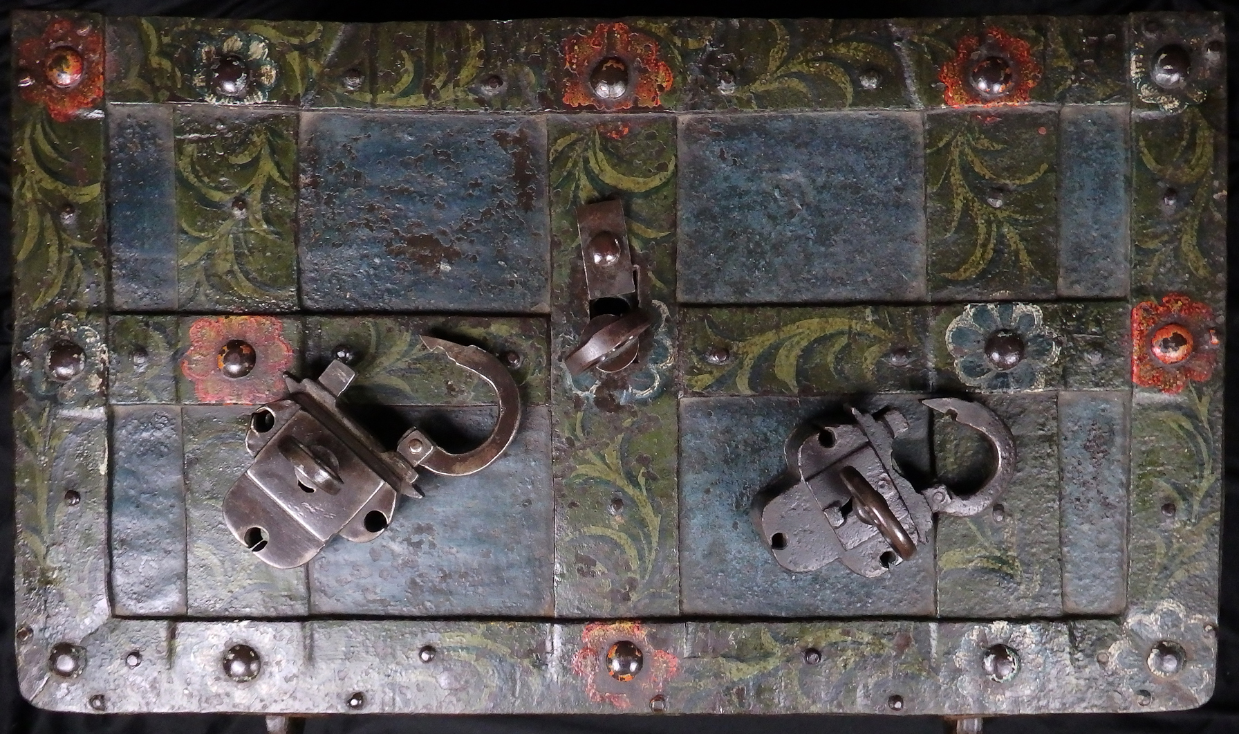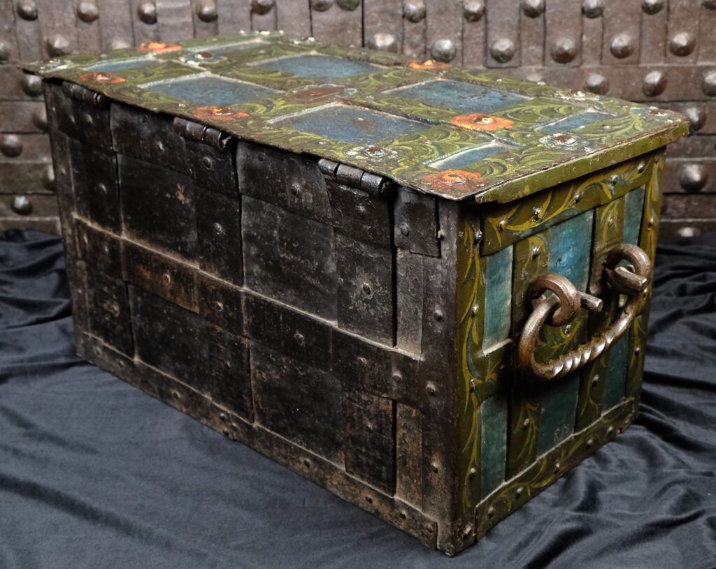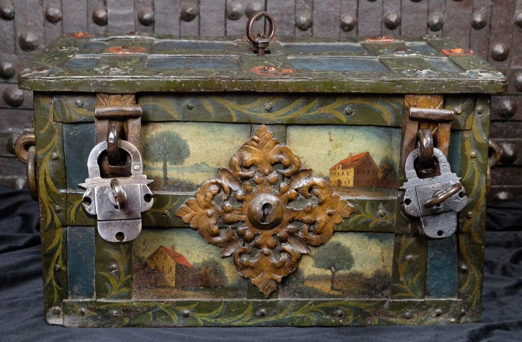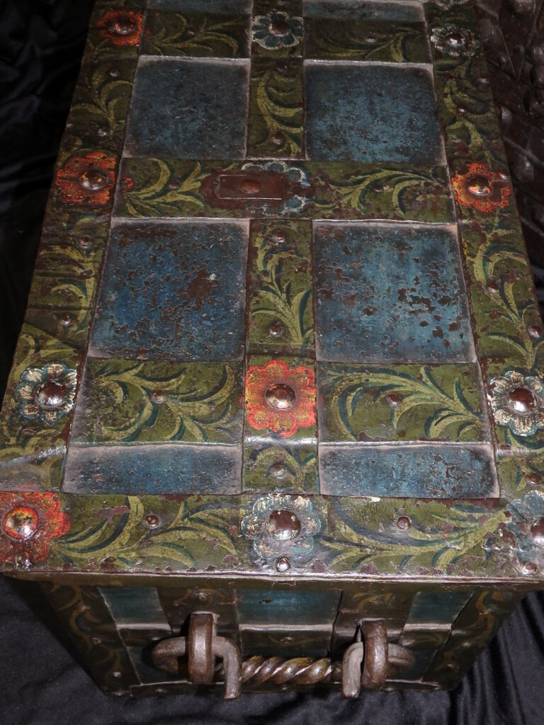 Barocke bemalte Eisentruhe mit zwei Hangschlössern.