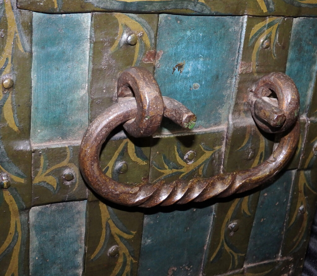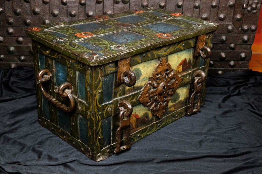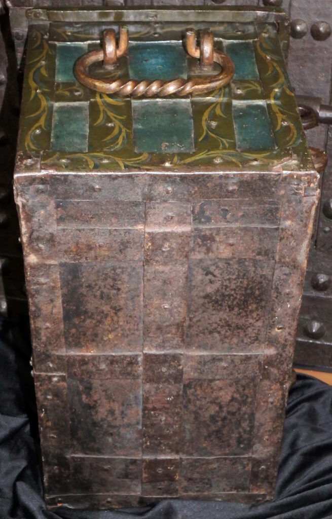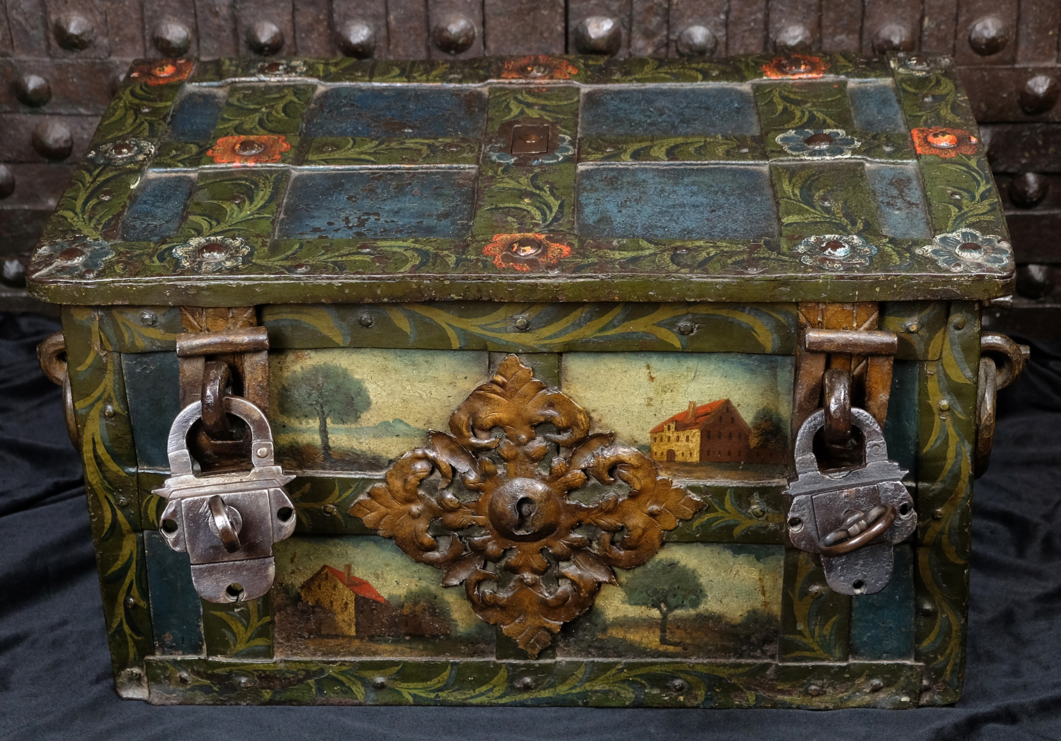 Barocke bemalte Eisentruhe mit zwei Hangschlössern.