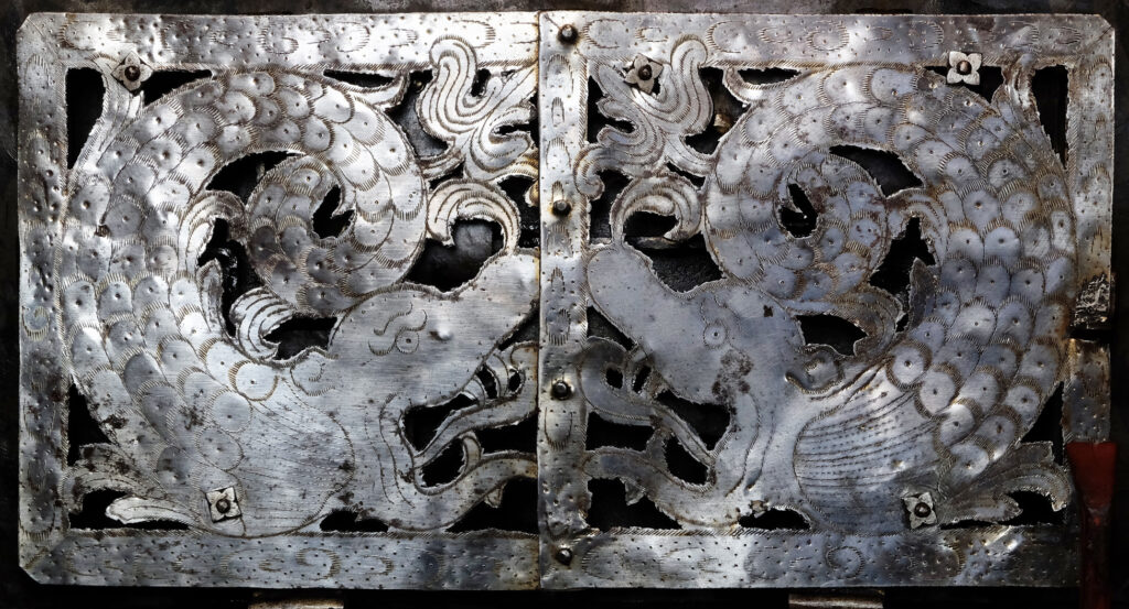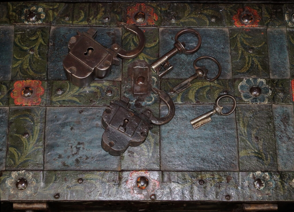 Die beiden aus dem 17. Jahrhundert stammenden Kleeblattschlösser passen sich hervorragend in die Optik der Truhe ein. Gern kann die Truhe auch ohne diese oder mit anderen Schlössern erworben werden.