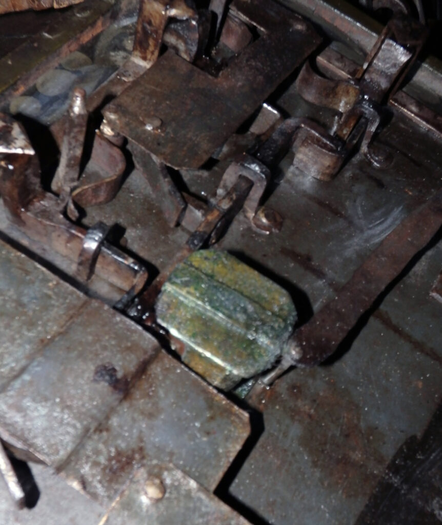 Sehr gute Originalsubstanz mit nur wenigen Alters- und Gebrauchsspuren. Originaler Schlüssel vorhanden. Auch die beiden Hangschlösser ebenso intakt.
