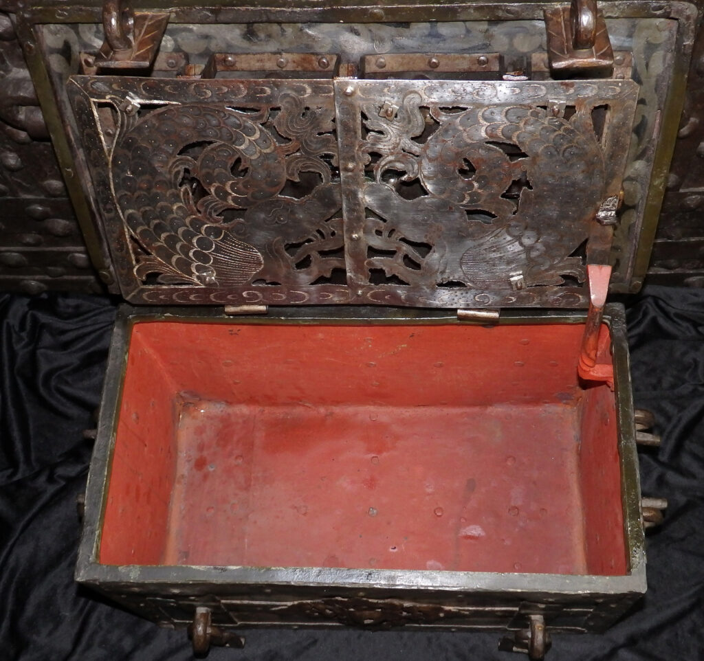 Hiermit wird die einwandfreie Herkunft dieser Truhe bestätigt. Diese ist zum Zeitpunkt des Verkaufs frei von Rechten Dritter.