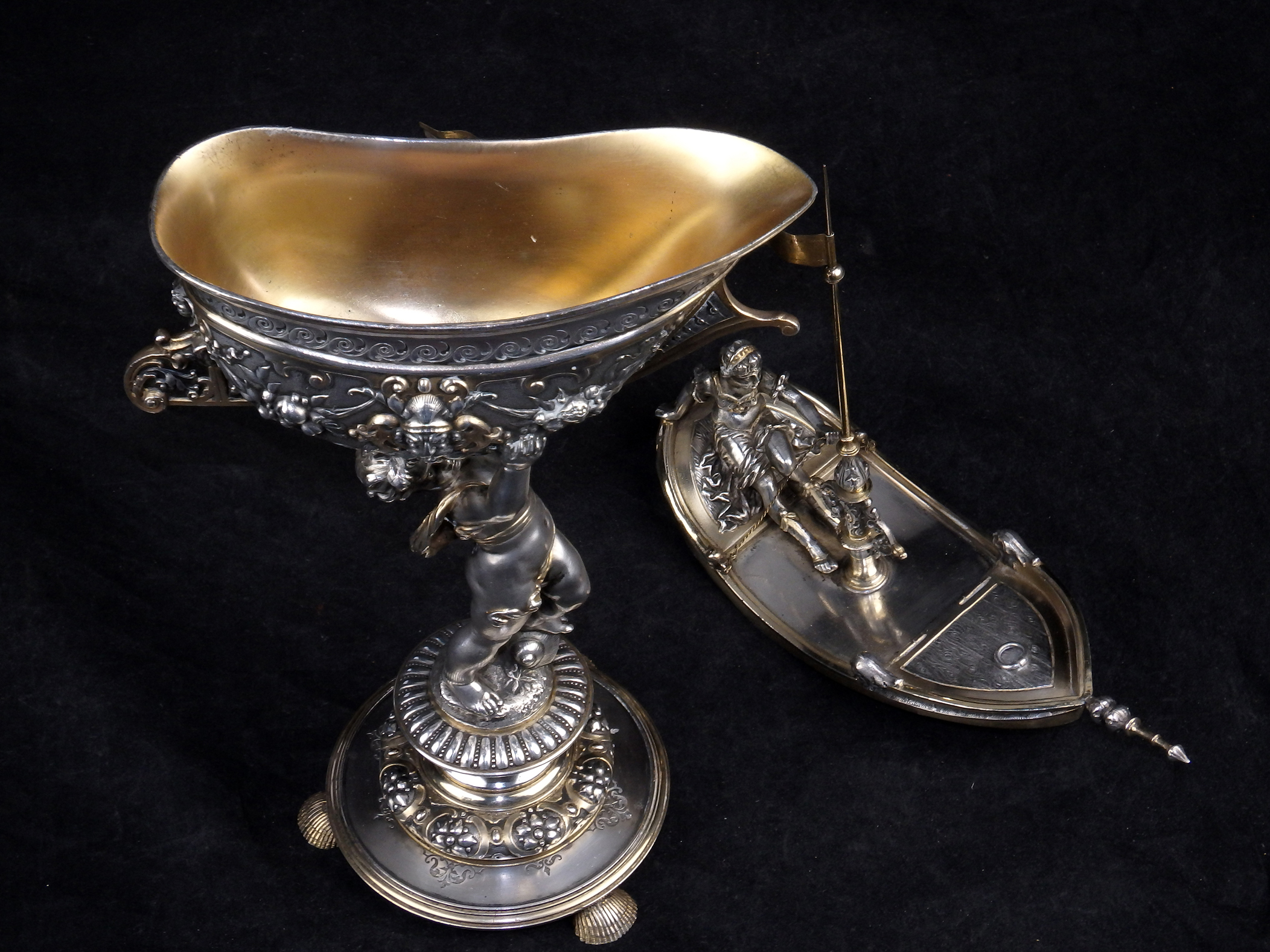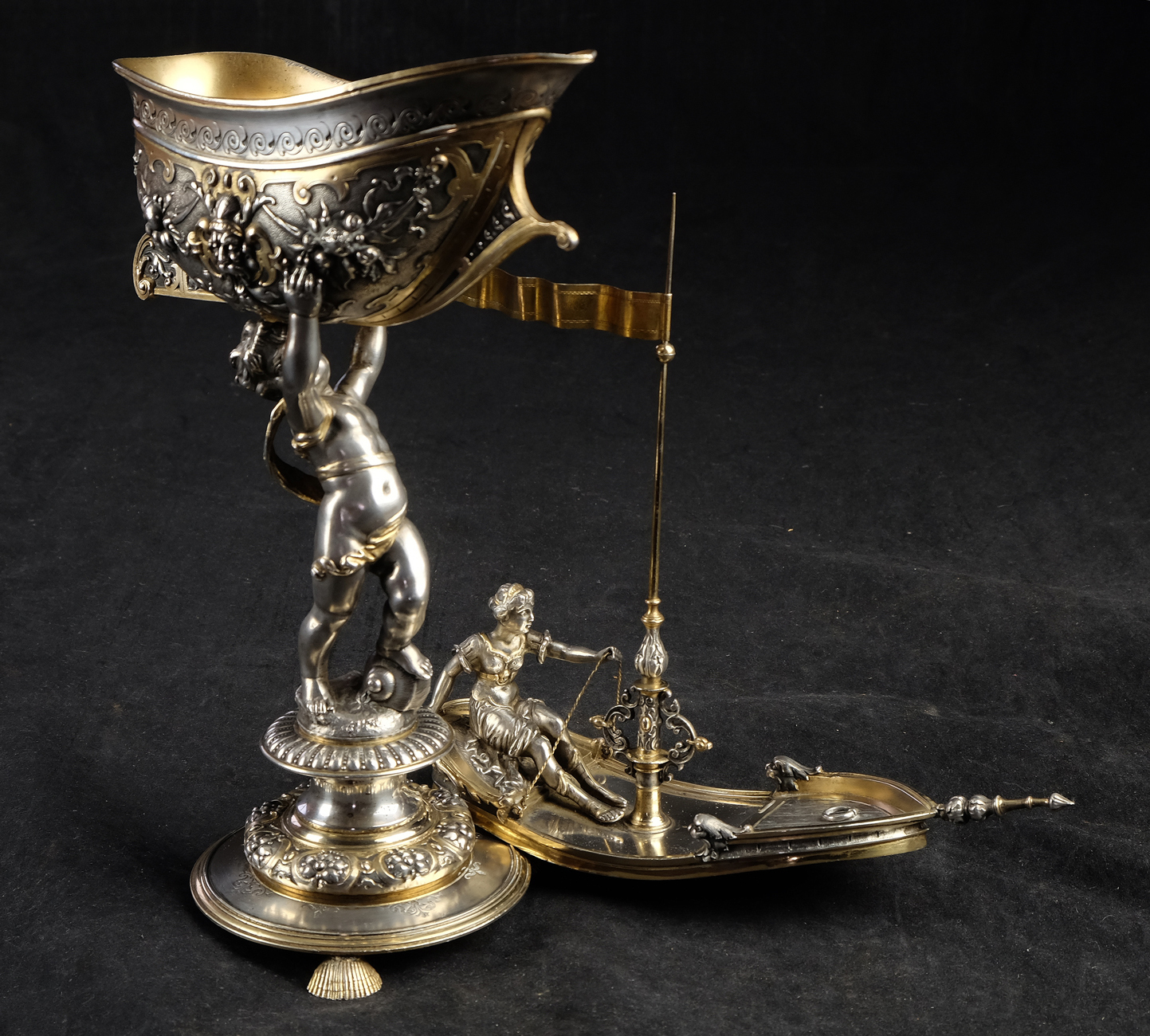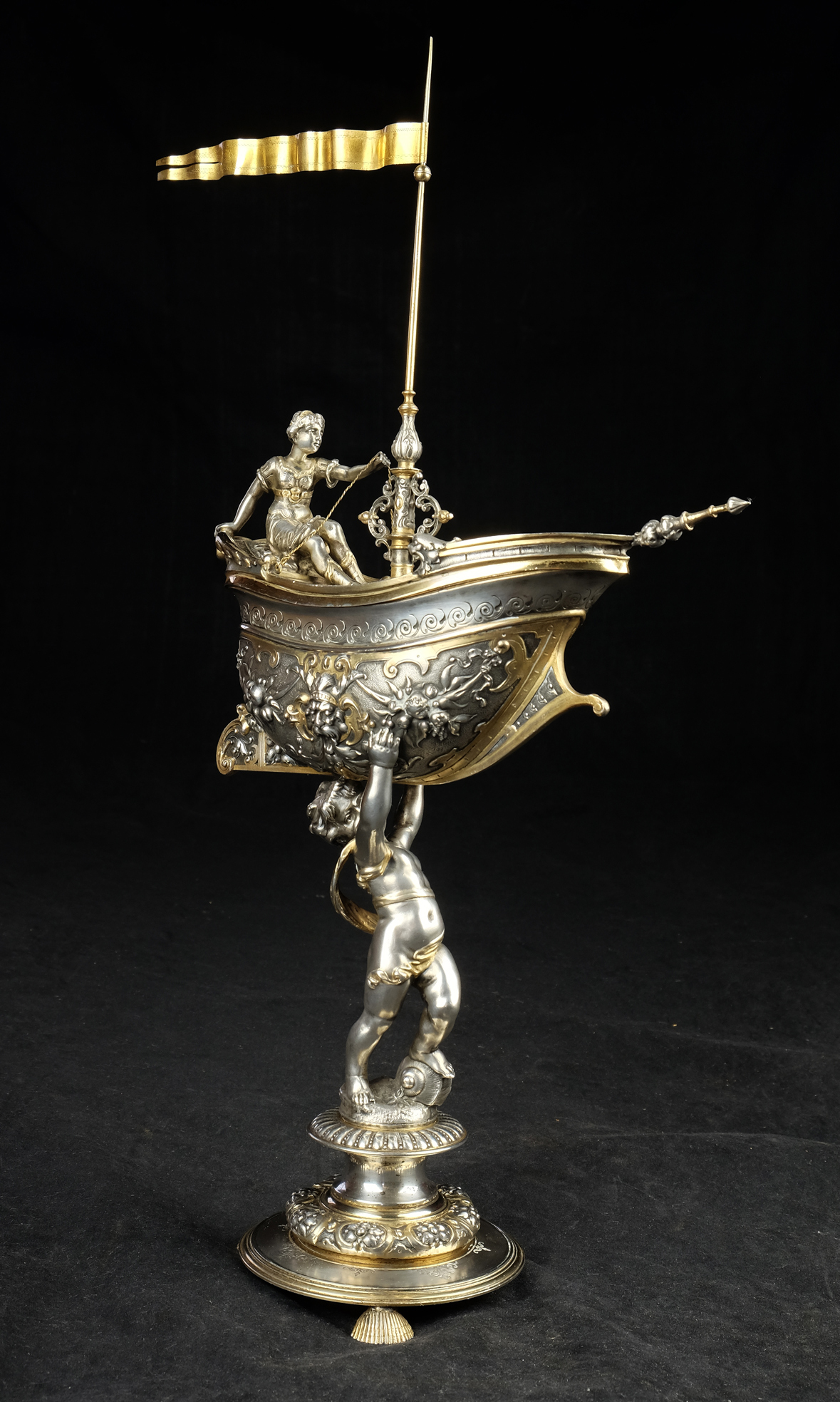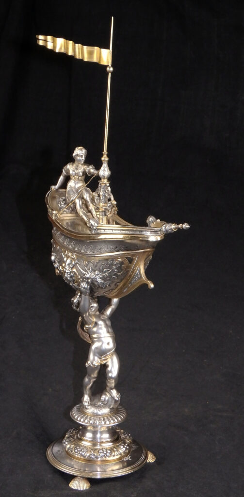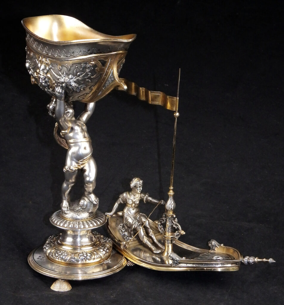 Detailreich gestalteter, prachtvoller Tafelaufsatz. Auf drei Muschelfüßen, mehrfach gestufter runder, verzierter Sockel. Der Schaft in Form eines vollplastischen Puttos, welcher eine reich reliefierte Schale in Schiffsform über seinem Haupt trägt. Der Schiffsrumpf ist figürlichen und floralen Renaissance-Motiven verziert. Der Deckel der Schale als Schiffsdeck gestaltet, mit am Heck sitzender Frauenfigur und gehisster Flagge. Partiell vergoldet.