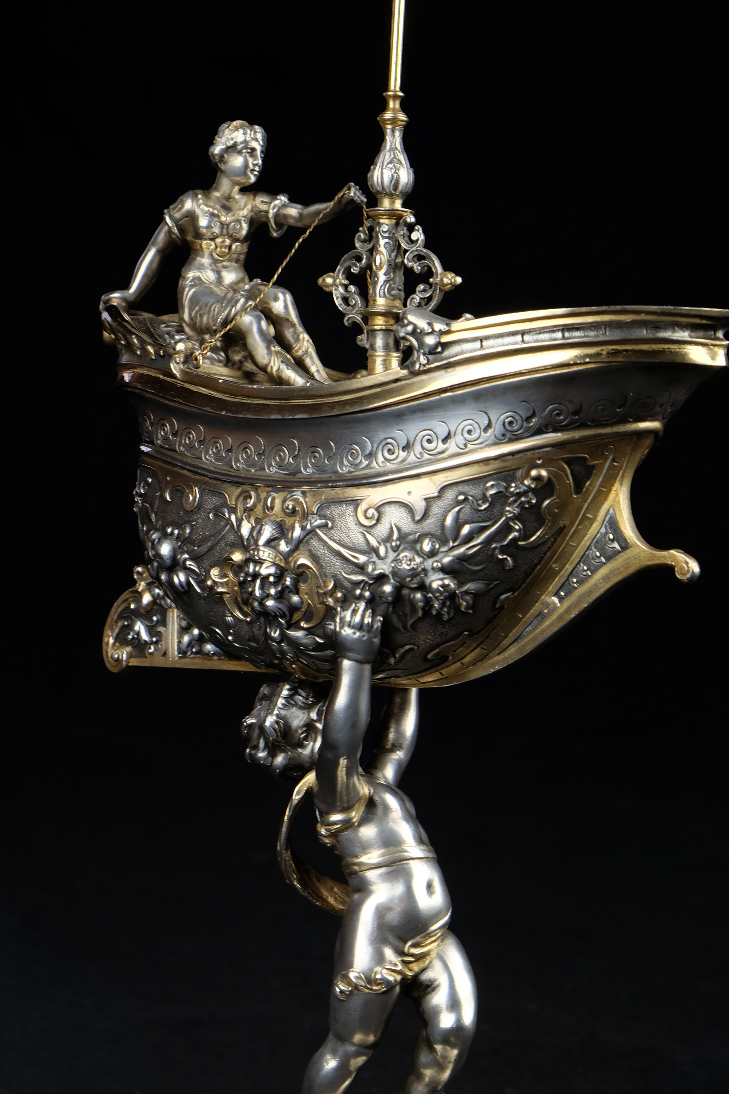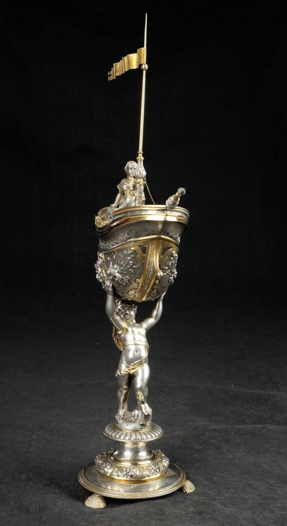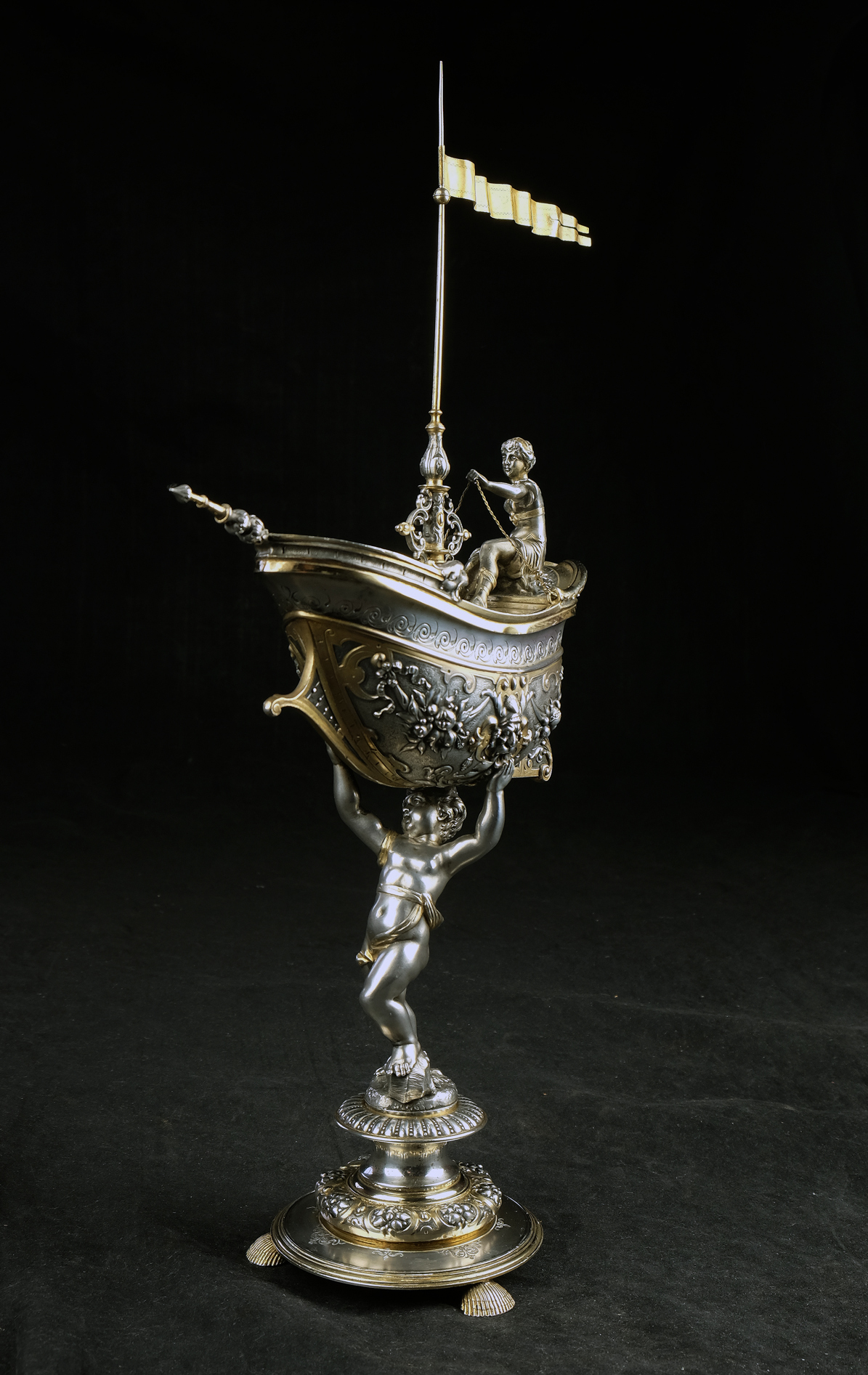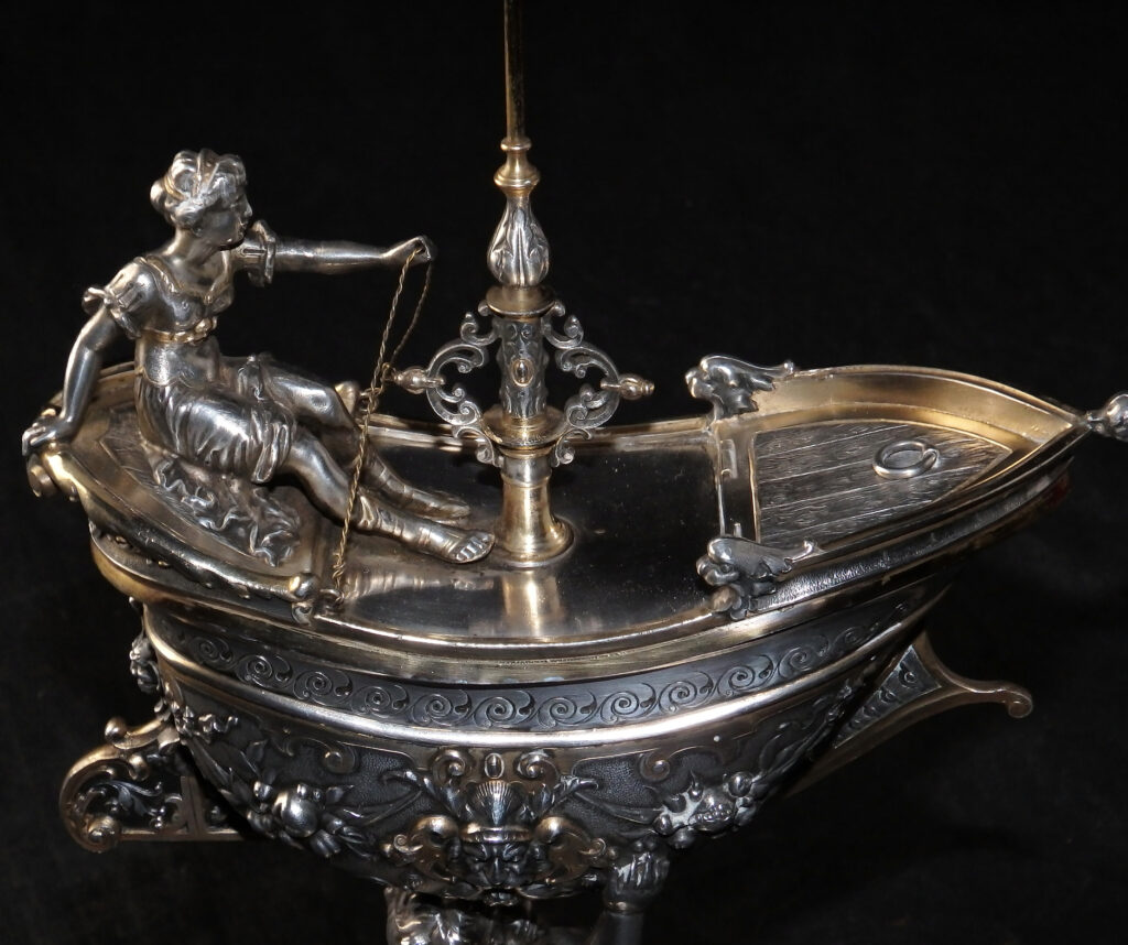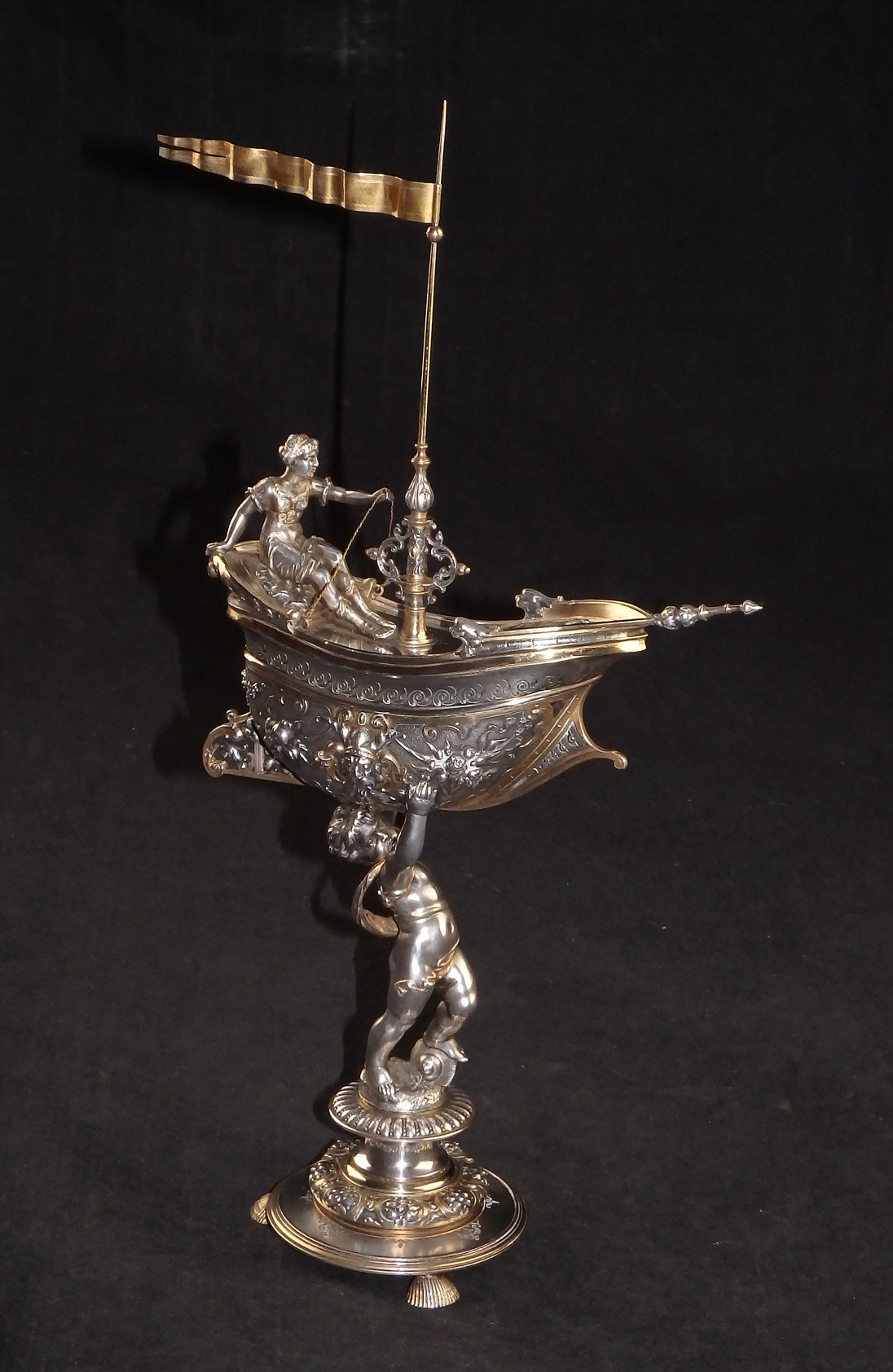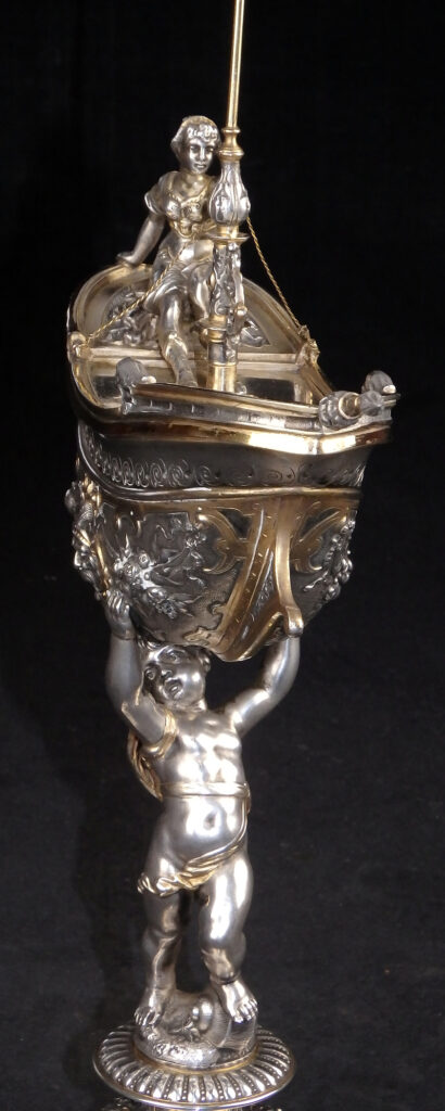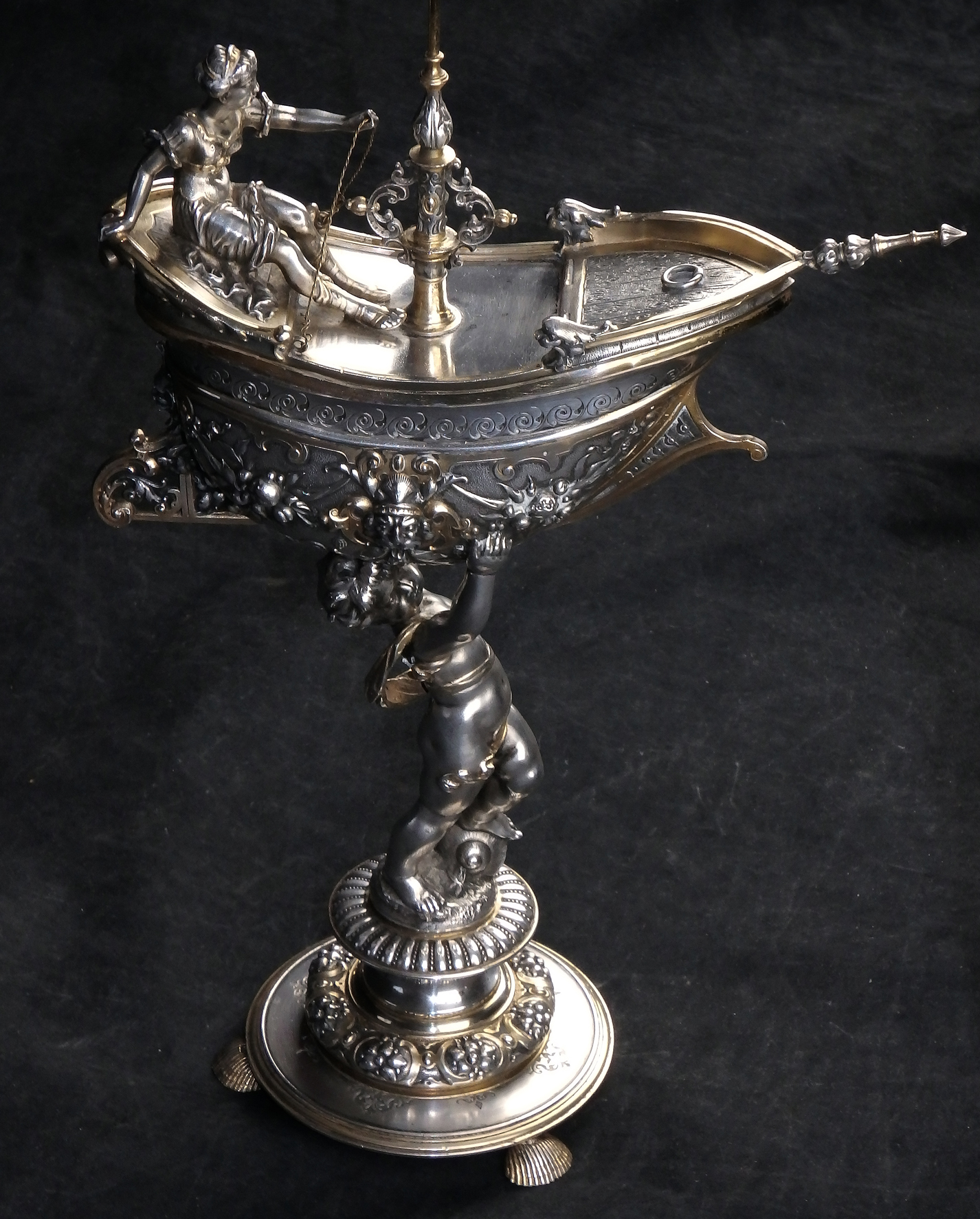 Detailreich gestalteter, prachtvoller Tafelaufsatz. Auf drei Muschelfüßen, mehrfach gestufter runder, verzierter Sockel. Der Schaft in Form eines vollplastischen Puttos, welcher eine reich reliefierte Schale in Schiffsform über seinem Haupt trägt. Der Schiffsrumpf ist figürlichen und floralen Renaissance-Motiven verziert. Der Deckel der Schale als Schiffsdeck gestaltet, mit am Heck sitzender Frauenfigur und gehisster Flagge. Partiell vergoldet.