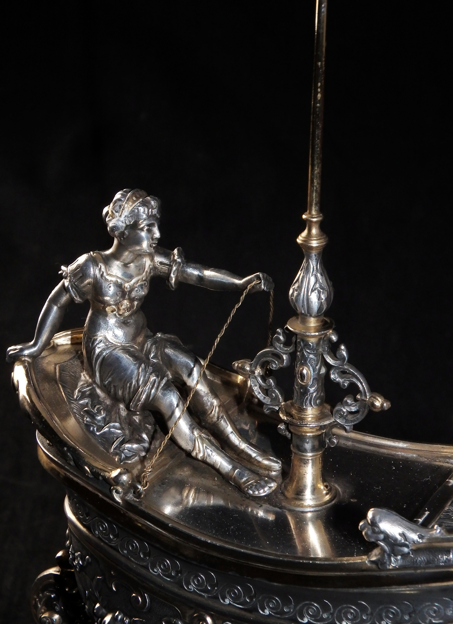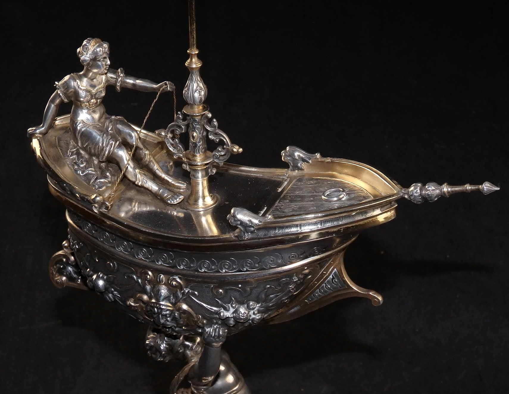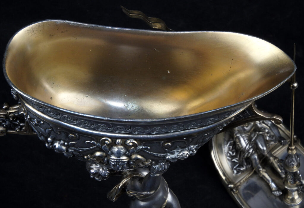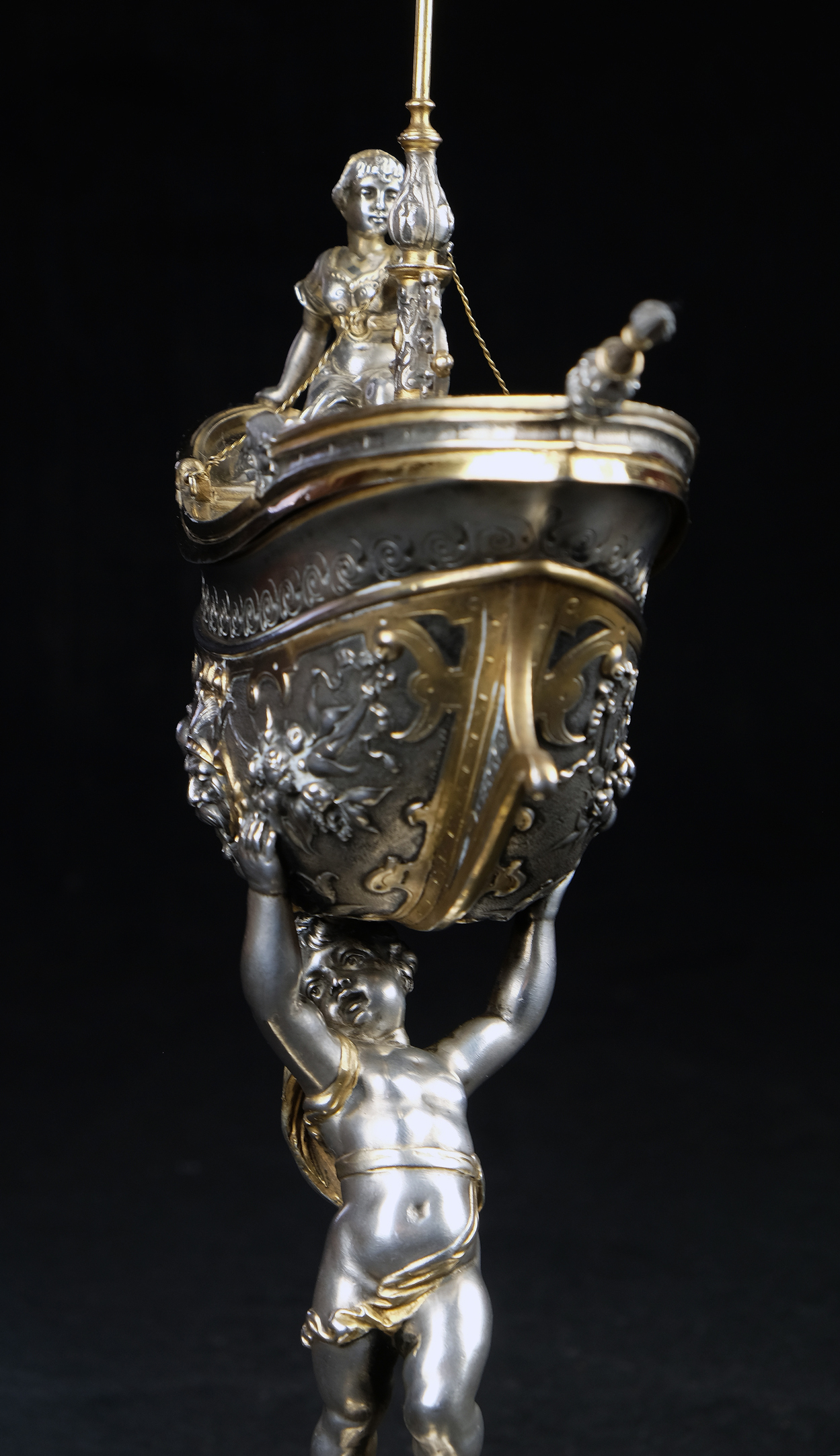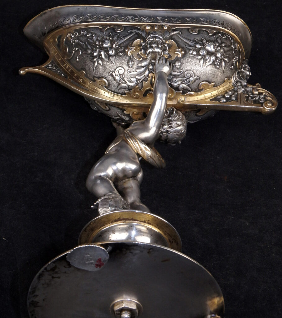 Detailreich gestalteter, prachtvoller Tafelaufsatz. Auf drei Muschelfüßen, mehrfach gestufter runder, verzierter Sockel. Der Schaft in Form eines vollplastischen Puttos, welcher eine reich reliefierte Schale in Schiffsform über seinem Haupt trägt. Der Schiffsrumpf ist figürlichen und floralen Renaissance-Motiven verziert. Der Deckel der Schale als Schiffsdeck gestaltet, mit am Heck sitzender Frauenfigur und gehisster Flagge. Partiell vergoldet.