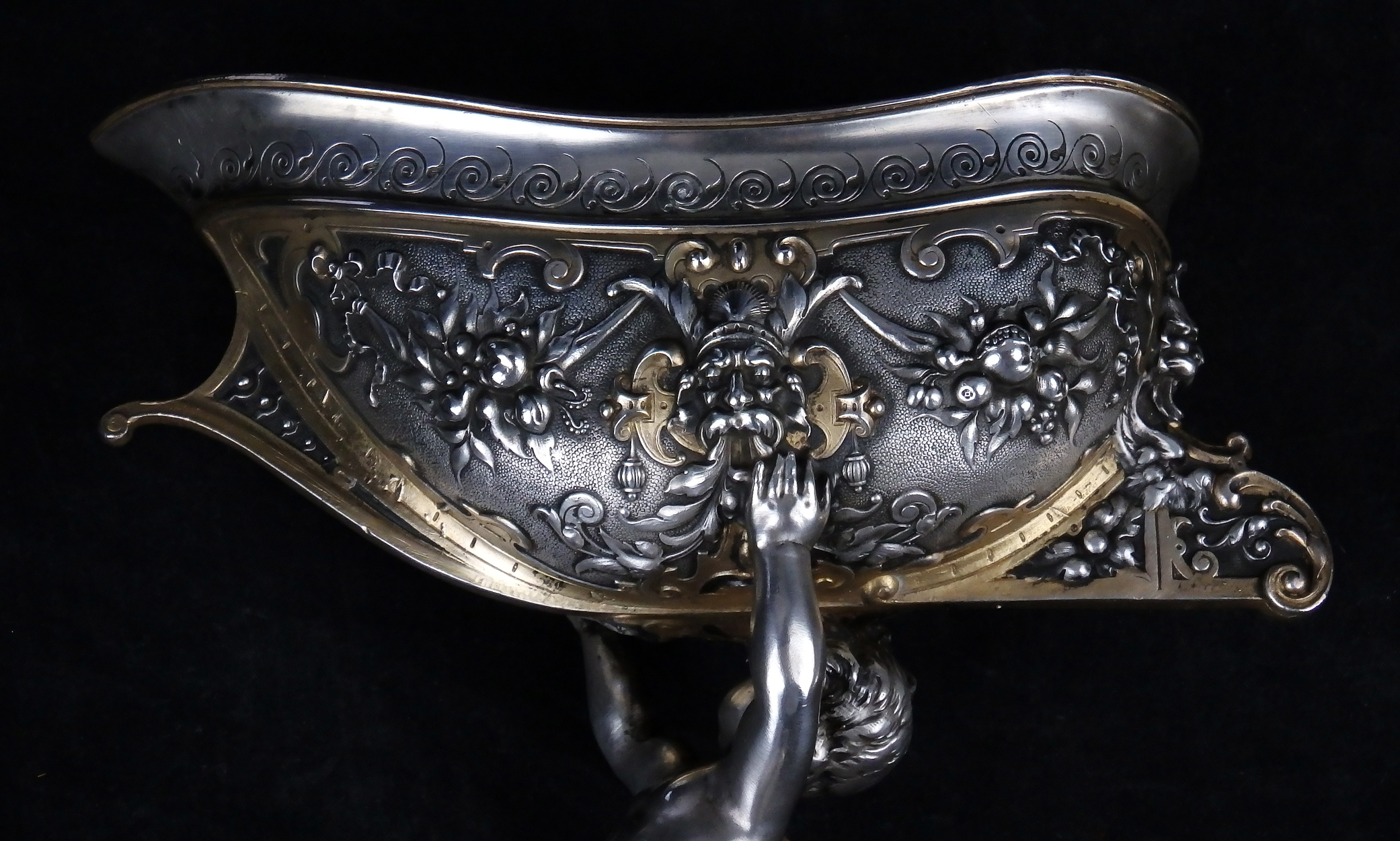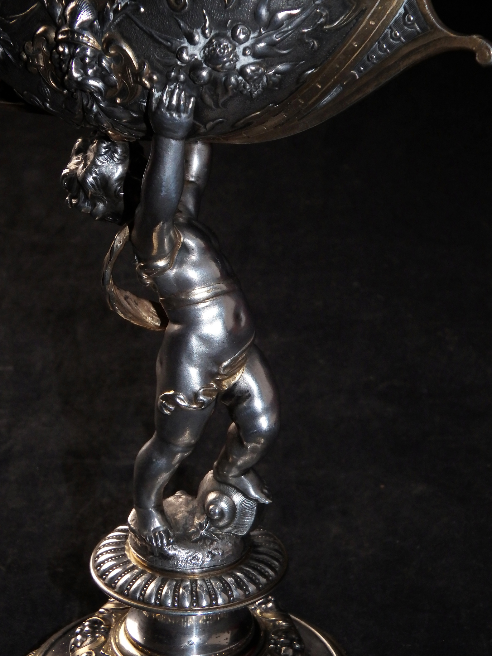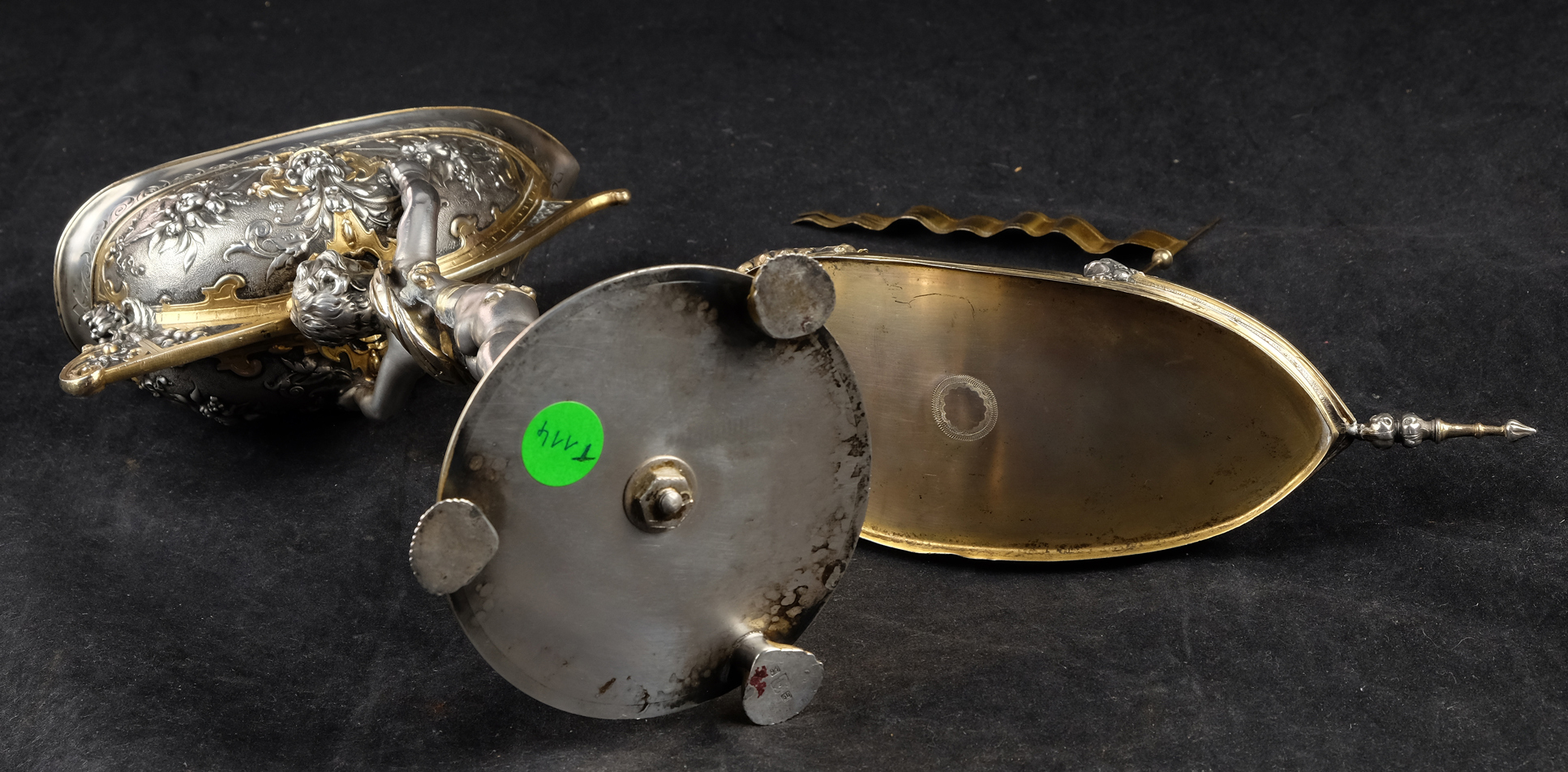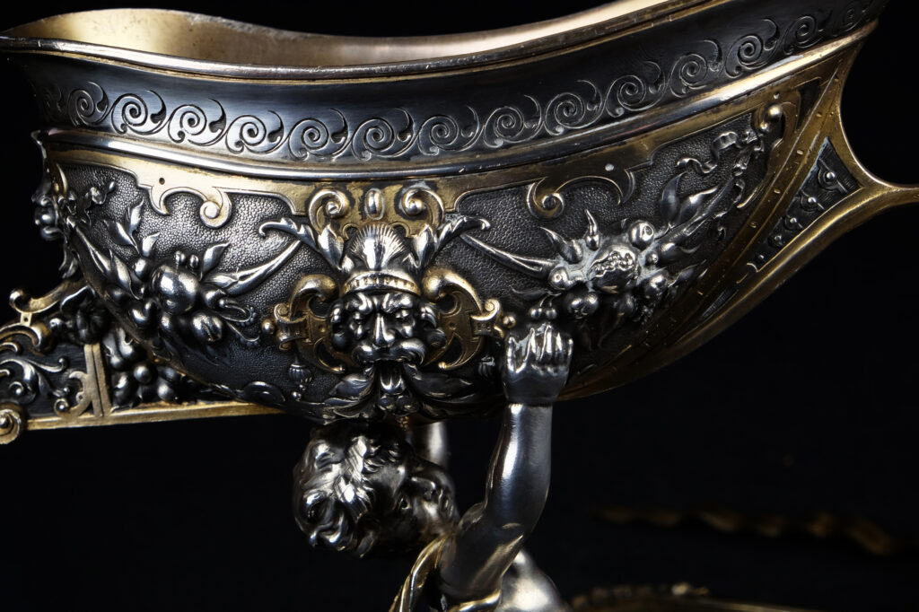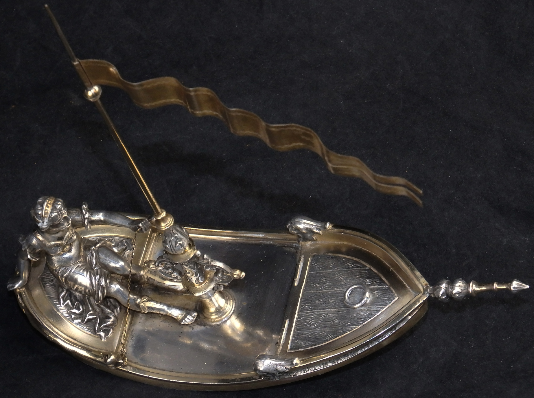 Detailreich gestalteter, prachtvoller Tafelaufsatz. Auf drei Muschelfüßen, mehrfach gestufter runder, verzierter Sockel. Der Schaft in Form eines vollplastischen Puttos, welcher eine reich reliefierte Schale in Schiffsform über seinem Haupt trägt. Der Schiffsrumpf ist figürlichen und floralen Renaissance-Motiven verziert. Der Deckel der Schale als Schiffsdeck gestaltet, mit am Heck sitzender Frauenfigur und gehisster Flagge. Partiell vergoldet.
